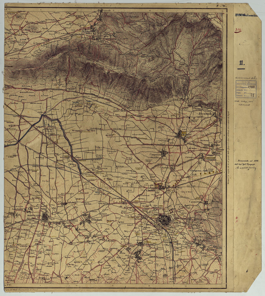 "Sono undici tavolette montate su tela, riconosciute nel 1876 da topografi dell'I.G.M. sopra copia tirate dai rami al 25.000 della Carta di Napoli e dintorni a quella stessa scala. In seguito a tali ricognizioni venne non soltanto aggiornata la planimetria, ma furono sostituite oltre al tratteggio le curve di livello tracciate all'equidistanza di 1o metri. Queste ricognizioni servirono per la formazione delle tavolette al 50.000 impiegate per la Carta d'Italia al 100.000. Ciascuna tavoletta reca il nome degli operatori e il visto del Capo-sezione Rosalba. Esse mostrano, segnate in rosso, tutte le correzioni e gli aggiornamenti notati durante i lavori di ricognizione. Annessi due fogli stampati (8 e 9) della suddetta carta di Napoli e dintorni eseguita dal R. Officio Topografico di Napoli e pubblicata in 15 fogli nel 1817-19, ove sono segnate le correzioni riportate dalle nuove levate."