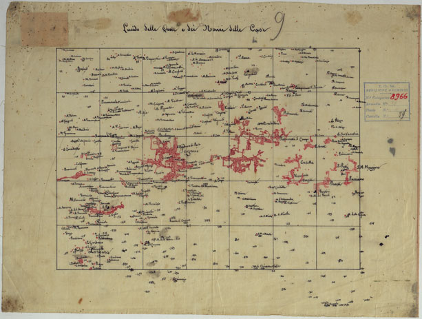 "Sono 21 minute di campagna eseguite da operatori dell'I.G.M. Rappresentano l'orografia con curve di livello tracciate all'equidistanza di 5m. Ciascuna minuta reca il nome dell'operatore. Diciasette di esse sono prive di toponomastica, ma hanno annesso un lucido con i nomi. Queste minute servirono per la compilazione delle tavolette al 50.000, usate per la costruzione della Carta d'Italia al 100.000. Nel titolo è stato riportato foglio 9 come scritto sulla minuta trattasi della stessa localizzazione geografica del foglio al numero di file A0001988. Il numero 9 del foglio è riportato anche nella carta dello stesso documento corrispondente al file A0001986, ma in questo caso la localizzazione geografica è diversa."