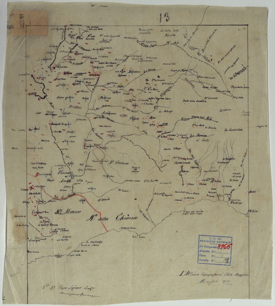 "Sono 21 minute di campagna eseguite da operatori dell'I.G.M. Rappresentano l'orografia con curve di livello tracciate all'equidistanza di 5m. Ciascuna minuta reca il nome dell'operatore. Diciasette di esse sono prive di toponomastica, ma hanno annesso un lucido con i nomi. Queste minute servirono per la compilazione delle tavolette al 50.000, usate per la costruzione della Carta d'Italia al 100.000. Nel titolo è stato riportato foglio 13 come scritto sulla minuta trattasi della stessa localizzazione geografica del foglio 13 al numero di file A0002003."