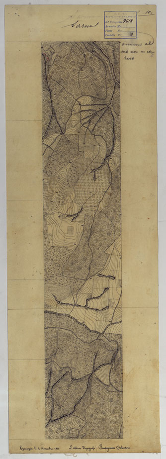 "Elementi originali che hanno servito per la formazione delle tavolette della CARTA TOPOGRAFICA DEL MONTE VESUVIO RILEVATA E DISEGNATA DAGLI ALLIEVI DELL'IST. TOPOGRAFICO MILITARE NEGLI ANNI 1875-76 ALLA SCALA DI 1:10.000 archiviata in questo stesso documento (n° d'Ordine 65 - Cart. d'Arch. 80 - Docum. 9618. Annessi lucidi d'insieme. Il titolo non è presente sulla carta. "
