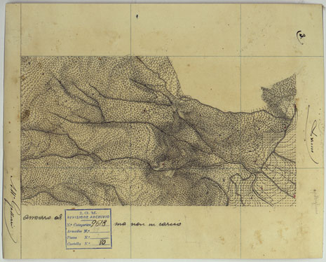 "Elementi originali che hanno servito per la formazione delle tavolette della CARTA TOPOGRAFICA DEL MONTE VESUVIO RILEVATA E DISEGNATA DAGLI ALLIEVI DELL'IST. TOPOGRAFICO MILITARE NEGLI ANNI 1875-76 ALLA SCALA DI 1:10.000 archiviata in questo stesso documento (n° d'Ordine 65 - Cart. d'Arch. 80 - Docum. 9618. Annessi lucidi d'insieme. Il titolo non è presente sulla carta. Annessi lucidi d'insieme. La localizzazione geografica di questa minuta è la zona sud di Migliano."