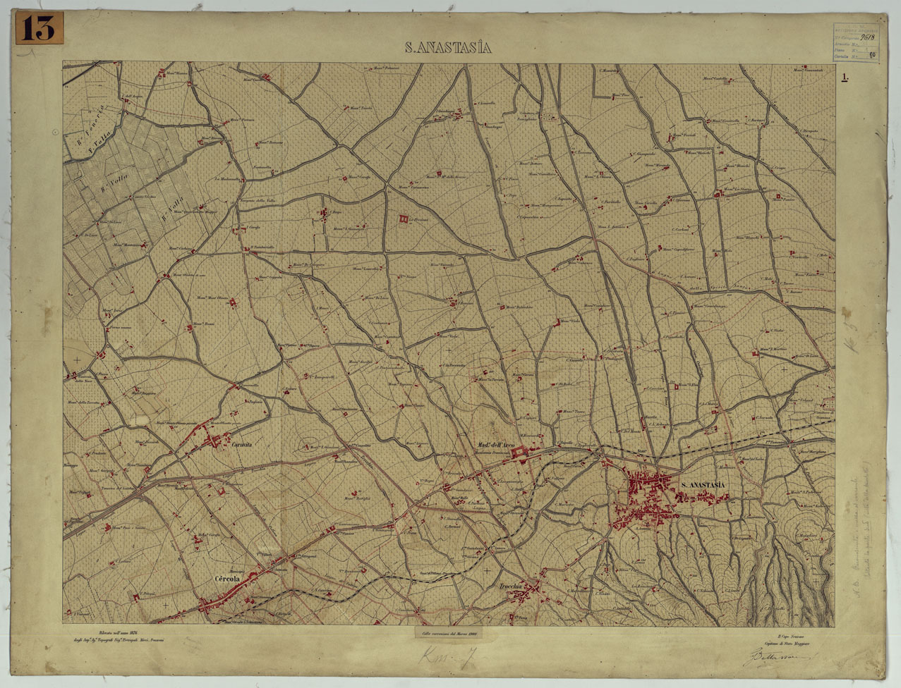 "Quindici tavolette disegnate in ufficio, tratte dai rilievi eseguiti da operatori dell'I.G.M. negli anni 1871-76. Sono montate su tela. Rappresentano l'orografia mediante curve di livello tracciate all'equidistanza di m. 5, gli abitati in rosso, le acque in azzurro, il rimanente della planimetria in nero. Sono mostrate le ferrovie, strade (4 classi: principali, mulattiere, campestri, sentieri), argini, muri, fossi e acquedotti, pozzi, cisterne, vigneti, orti, boschi, ecc., ecc., confini amministrativi. Ciascuna tavoletta reca le firme degli operatori e la data dei rilievi. Alcune sono aggiornate al 1900. Annessi un foglio titolo con quadro d'unione incompleto e la leggenda dei segni convenzionali e un secondo quadro d'unione alla scala di 1:100.000, stampato nel 1884. Queste tavolette servirono per la formazione della carta al 100.000. Annesso a questa carta è archiviato anche il documento VESUVIO E DINTORNI (numero d'ordine 63 - Cart. d'Arch. 80 - Docum. 9618 composto da 42 spezzoni e i lucidi d'insieme che sono serviti per la formazione di questa carta."