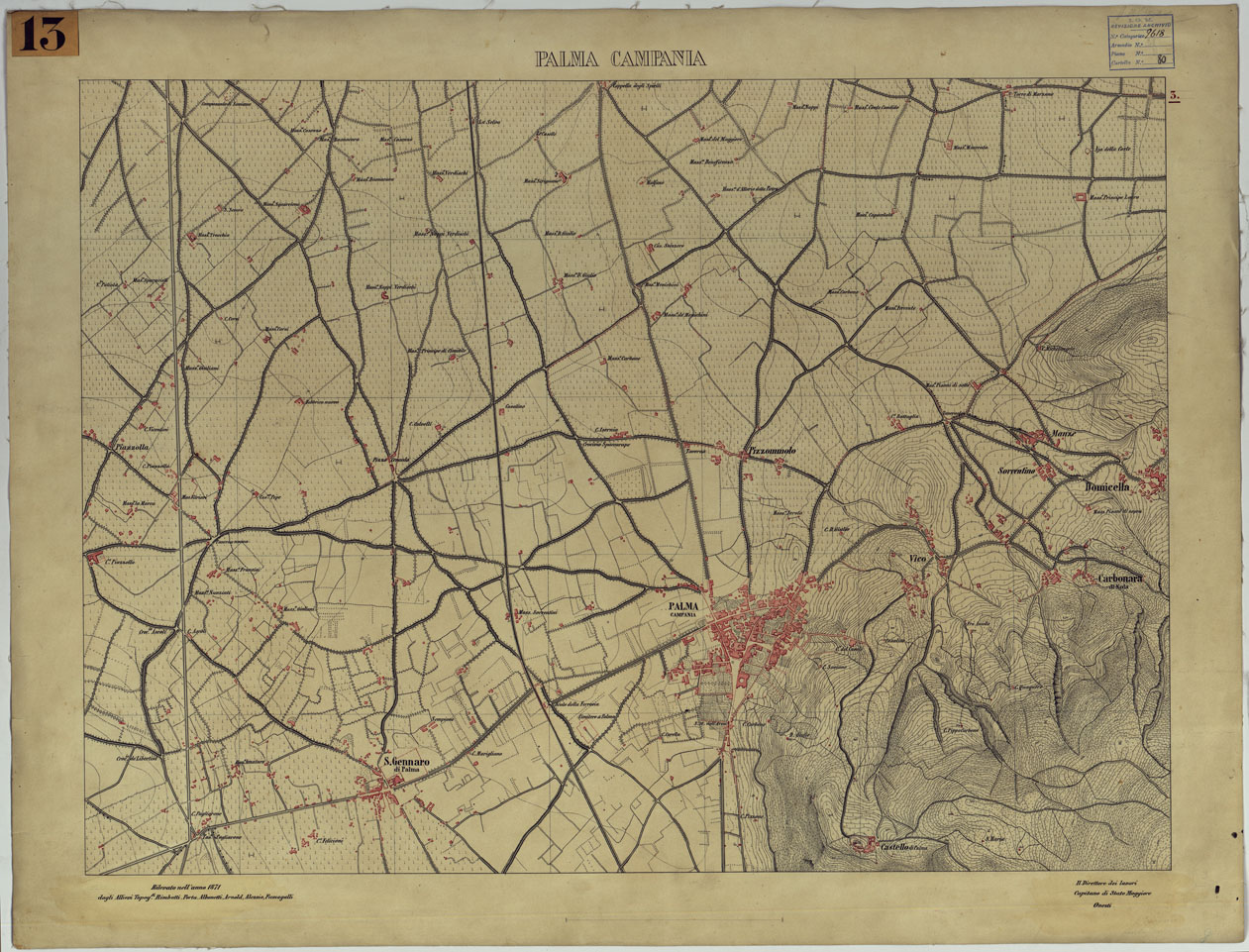 "Quindici tavolette disegnate in ufficio, tratte dai rilievi eseguiti da operatori dell'I.G.M. negli anni 1871-76. Sono montate su tela. Rappresentano l'orografia mediante curve di livello tracciate all'equidistanza di m. 5, gli abitati in rosso, le acque in azzurro, il rimanente della planimetria in nero. Sono mostrate le ferrovie, strade (4 classi: principali, mulattiere, campestri, sentieri), argini, muri, fossi e acquedotti, pozzi, cisterne, vigneti, orti, boschi, ecc., ecc., confini amministrativi. Ciascuna tavoletta reca le firme degli operatori e la data dei rilievi. Alcune sono aggiornate al 1900. Annessi un foglio titolo con quadro d'unione incompleto e la leggenda dei segni convenzionali e un secondo quadro d'unione alla scala di 1:100.000, stampato nel 1884. Queste tavolette servirono per la formazione della carta al 100.000. Annesso a questa carta è archiviato anche il documento VESUVIO E DINTORNI (numero d'ordine 63 - Cart. d'Arch. 80 - Docum. 9618 - Files A0002072-2126) composto da 42 spezzoni e i lucidi d'insieme che sono serviti per la formazione di questa carta."