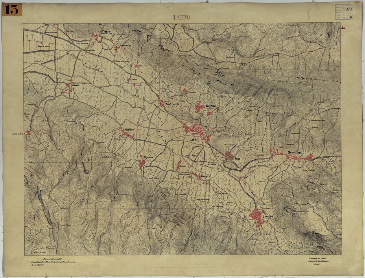 "Quindici tavolette disegnate in ufficio, tratte dai rilievi eseguiti da operatori dell'I.G.M. negli anni 1871-76. Sono montate su tela. Rappresentano l'orografia mediante curve di livello tracciate all'equidistanza di m. 5, gli abitati in rosso, le acque in azzurro, il rimanente della planimetria in nero. Sono mostrate le ferrovie, strade (4 classi: principali, mulattiere, campestri, sentieri), argini, muri, fossi e acquedotti, pozzi, cisterne, vigneti, orti, boschi, ecc., ecc., confini amministrativi. Ciascuna tavoletta reca le firme degli operatori e la data dei rilievi. Alcune sono aggiornate al 1900. Annessi un foglio titolo con quadro d'unione incompleto e la leggenda dei segni convenzionali e un secondo quadro d'unione alla scala di 1:100.000, stampato nel 1884. Queste tavolette servirono per la formazione della carta al 100.000. Annesso a questa carta è archiviato anche il documento VESUVIO E DINTORNI (numero d'ordine 63 - Cart. d'Arch. 80 - Docum. 9618 - Files A0002072-2126) composto da 42 spezzoni e i lucidi d'insieme che sono serviti per la formazione di questa carta."