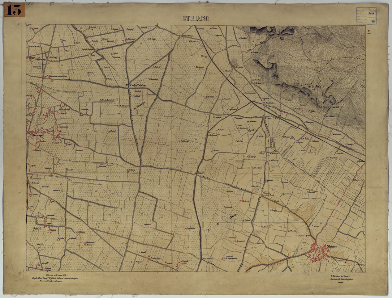 "Quindici tavolette disegnate in ufficio, tratte dai rilievi eseguiti da operatori dell'I.G.M. negli anni 1871-76. Sono montate su tela. Rappresentano l'orografia mediante curve di livello tracciate all'equidistanza di m. 5, gli abitati in rosso, le acque in azzurro, il rimanente della planimetria in nero. Sono mostrate le ferrovie, strade (4 classi: principali, mulattiere, campestri, sentieri), argini, muri, fossi e acquedotti, pozzi, cisterne, vigneti, orti, boschi, ecc., ecc., confini amministrativi. Ciascuna tavoletta reca le firme degli operatori e la data dei rilievi. Alcune sono aggiornate al 1900. Annessi un foglio titolo con quadro d'unione incompleto e la leggenda dei segni convenzionali e un secondo quadro d'unione alla scala di 1:100.000, stampato nel 1884. Queste tavolette servirono per la formazione della carta al 100.000. Annesso a questa carta è archiviato anche il documento VESUVIO E DINTORNI (numero d'ordine 63 - Cart. d'Arch. 80 - Docum. 9618 - composto da 42 spezzoni e i lucidi d'insieme che sono serviti per la formazione di questa carta."