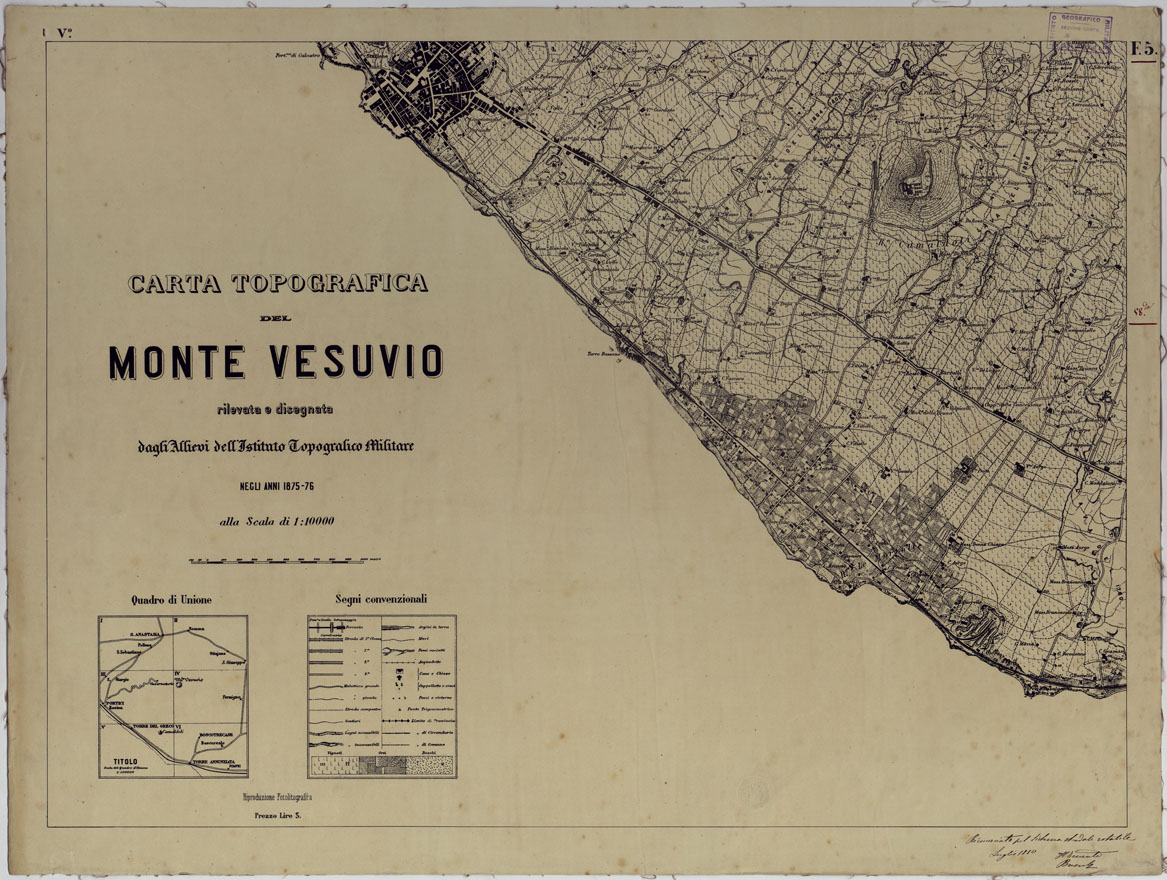 "Quindici tavolette disegnate in ufficio, tratte dai rilievi eseguiti da operatori dell'I.G.M. negli anni 1871-76. Sono montate su tela. Rappresentano l'orografia mediante curve di livello tracciate all'equidistanza di m. 5, gli abitati in rosso, le acque in azzurro, il rimanente della planimetria in nero. Sono mostrate le ferrovie, strade (4 classi: principali, mulattiere, campestri, sentieri), argini, muri, fossi e acquedotti, pozzi, cisterne, vigneti, orti, boschi, ecc., ecc., confini amministrativi. Ciascuna tavoletta reca le firme degli operatori e la data dei rilievi. Alcune sono aggiornate al 1900. Annessi un foglio titolo con quadro d'unione incompleto e la leggenda dei segni convenzionali e un secondo quadro d'unione alla scala di 1:100.000, stampato nel 1884. Queste tavolette servirono per la formazione della carta al 100.000. Annesso a questa carta è archiviato anche il documento VESUVIO E DINTORNI (numero d'ordine 63 - Cart. d'Arch. 80 - Docum. 9618 composto da 42 spezzoni e i lucidi d'insieme che sono serviti per la formazione di questa carta."