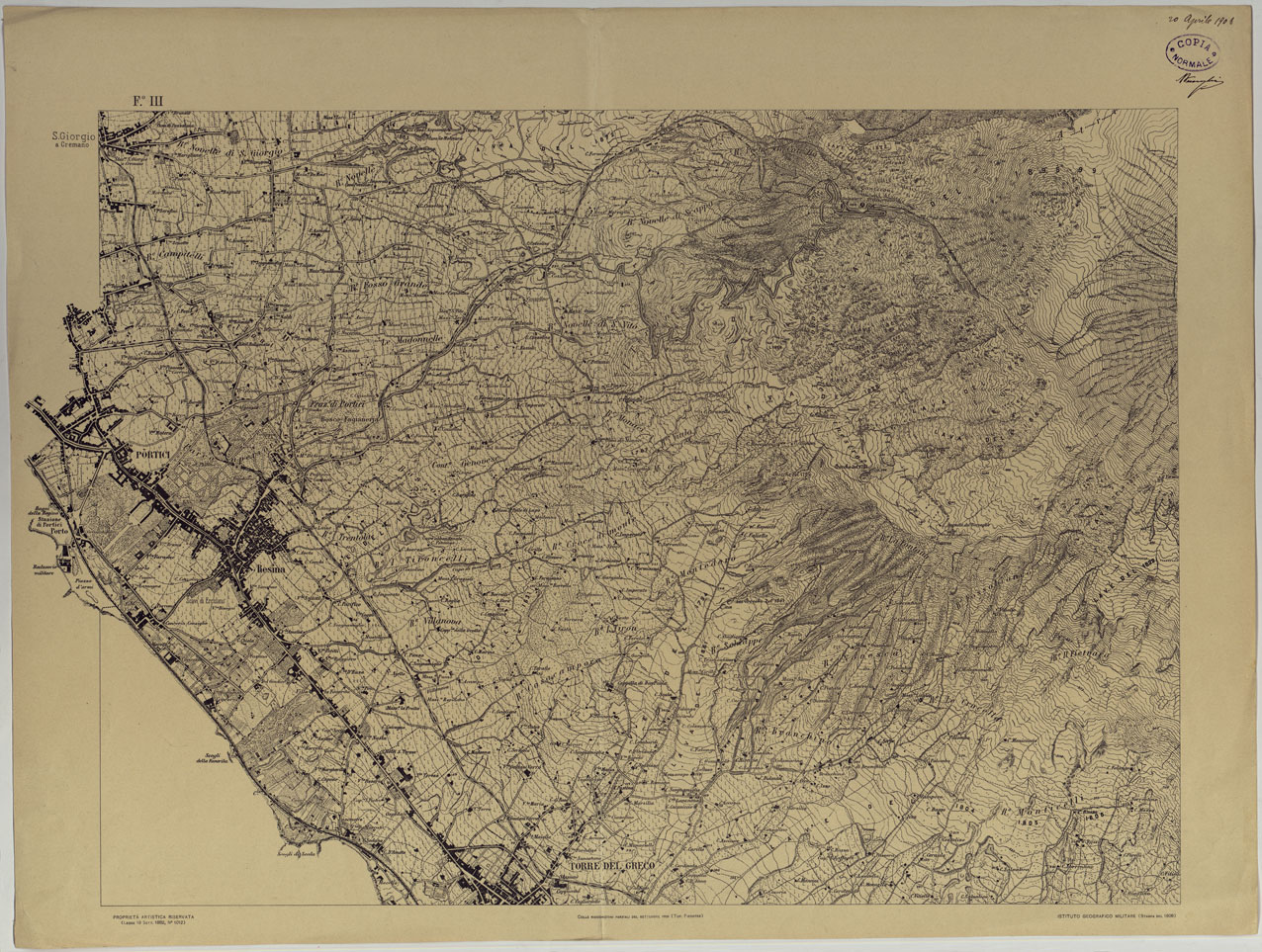CARTA TOPOGRAFICA DEL MONTE VESUVIO RILEVATA E DISEGNATA DAGLI ALLIEVI DELL'ISTITUTO TOPOGRAFICO MIITARE NEGLI ANNI 1876-76 ALLA SCALA DI 1:10000 - FOGLIO III.