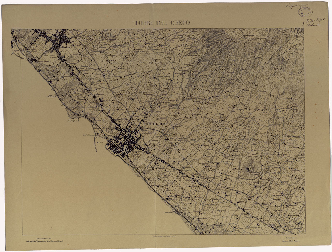 CARTA TOPOGRAFICA DEL MONTE VESUVIO RILEVATA E DISEGNATA DAGLI ALLIEVI DELL'ISTITUTO TOPOGRAFICO MIITARE NEGLI ANNI 1876-76 ALLA SCALA DI 1:10000 - TORRE DEL GRECO.