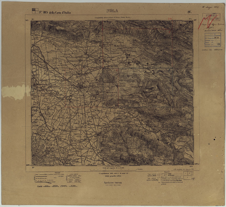 "Quindici tavolette disegnate in ufficio, tratte dai rilievi eseguiti da operatori dell'I.G.M. negli anni 1871-76. Sono montate su tela. Rappresentano l'orografia mediante curve di livello tracciate all'equidistanza di m. 5, gli abitati in rosso, le acque in azzurro, il rimanente della planimetria in nero. Sono mostrate le ferrovie, strade (4 classi: principali, mulattiere, campestri, sentieri), argini, muri, fossi e acquedotti, pozzi, cisterne, vigneti, orti, boschi, ecc., ecc., confini amministrativi. Ciascuna tavoletta reca le firme degli operatori e la data dei rilievi. Alcune sono aggiornate al 1900. Annessi un foglio titolo con quadro d'unione incompleto e la leggenda dei segni convenzionali e un secondo quadro d'unione alla scala di 1:100.000, stampato nel 1884. Queste tavolette servirono per la formazione della carta al 100.000. Annesso a questa carta è archiviato anche il documento VESUVIO E DINTORNI (numero d'ordine 63 - Cart. d'Arch. 80 - Docum. 9618 composto da 42 spezzoni e i lucidi d'insieme che sono serviti per la formazione di questa carta."