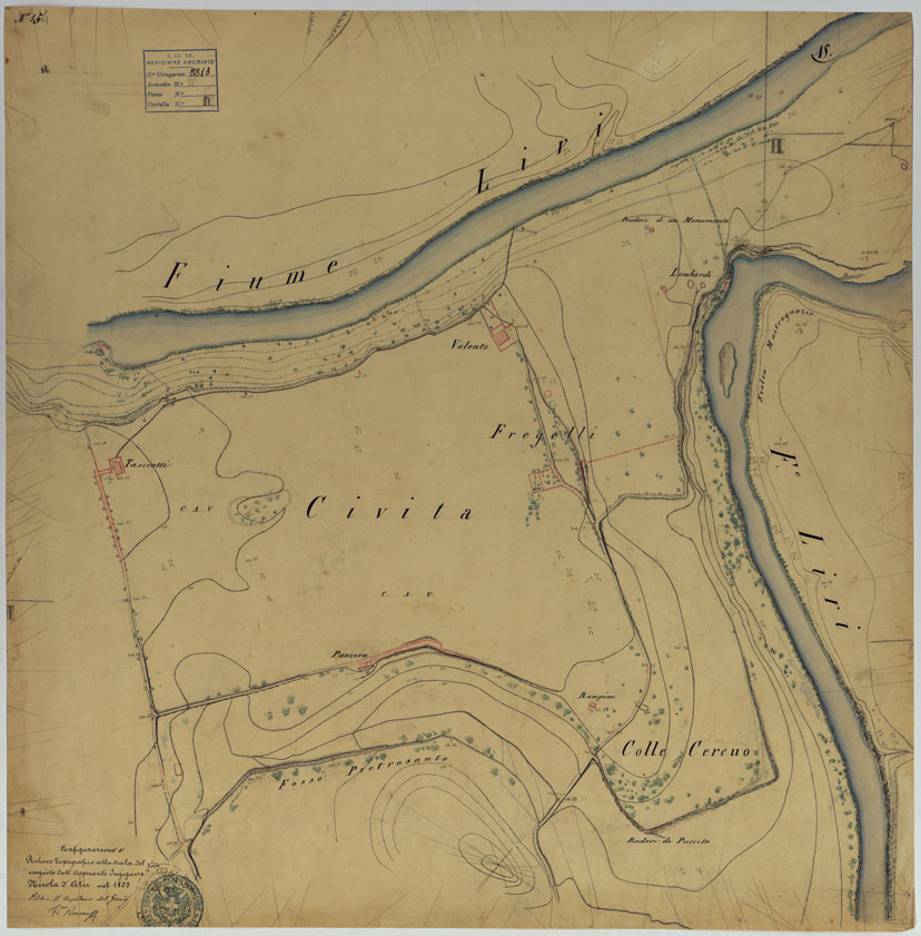 "Ventidue tavolette eseguite da ufficiali del R. Topografico di Napoli. Rappresentano l'orografia mediante curve di livello geometriche le acque sono colorate in azzurro le vegetazioni in verde gli abitati in rosso. Ciascuna tavoletta reca la firma dell'operatore e la data. Annesso un "Grafico delle operazioni geodetiche intorno ad Isoletta" eseguite nel maggio 1853 dall'asp. Top. G. de Vita e dirette dall'Ing. Schiavoni. Il titolo non è presente sulla carta."