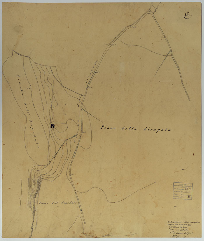 "Ventidue tavolette eseguite da ufficiali del R. Topografico di Napoli. Rappresentano l'orografia mediante curve di livello geometriche le acque sono colorate in azzurro le vegetazioni in verde gli abitati in rosso. Ciascuna tavoletta reca la firma dell'operatore e la data. Annesso un "Grafico delle operazioni geodetiche intorno ad Isoletta" eseguite nel maggio 1853 dall'asp. Top. G. de Vita e dirette dall'Ing. Schiavoni. Il titolo non è presente sulla carta."
