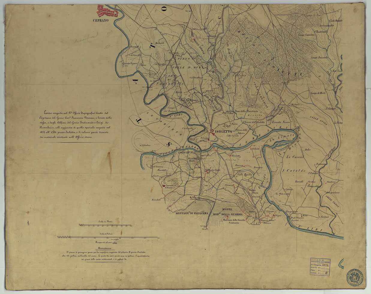 "Carta in due fogli, montati su tela, disegnati, con orografia a curve di livello tracciate all'equidistanza di 20 palmi, abitati in rosso, acque in azzurro, rimanente della planimetria in nero. Le quote delle elevazioni sono calcolate in palmi. Sul foglio occidentale è la seguente nota: "Lavoro eseguito nel R.le Officio Topografico diretto dal Cap. del Genio Cav. Francesco Verneau, e levato dallo stesso, e dagli alfieri del Genio Ferdinando e Luigi di Rosenheim, coll'aggiunta di quello speciale eseguito nel 1853 all'1:2.000 presso Isoletta, e di talune parti desunte dai materiali esistenti nell'Officio stesso". Il titolo non è presente sulla carta."