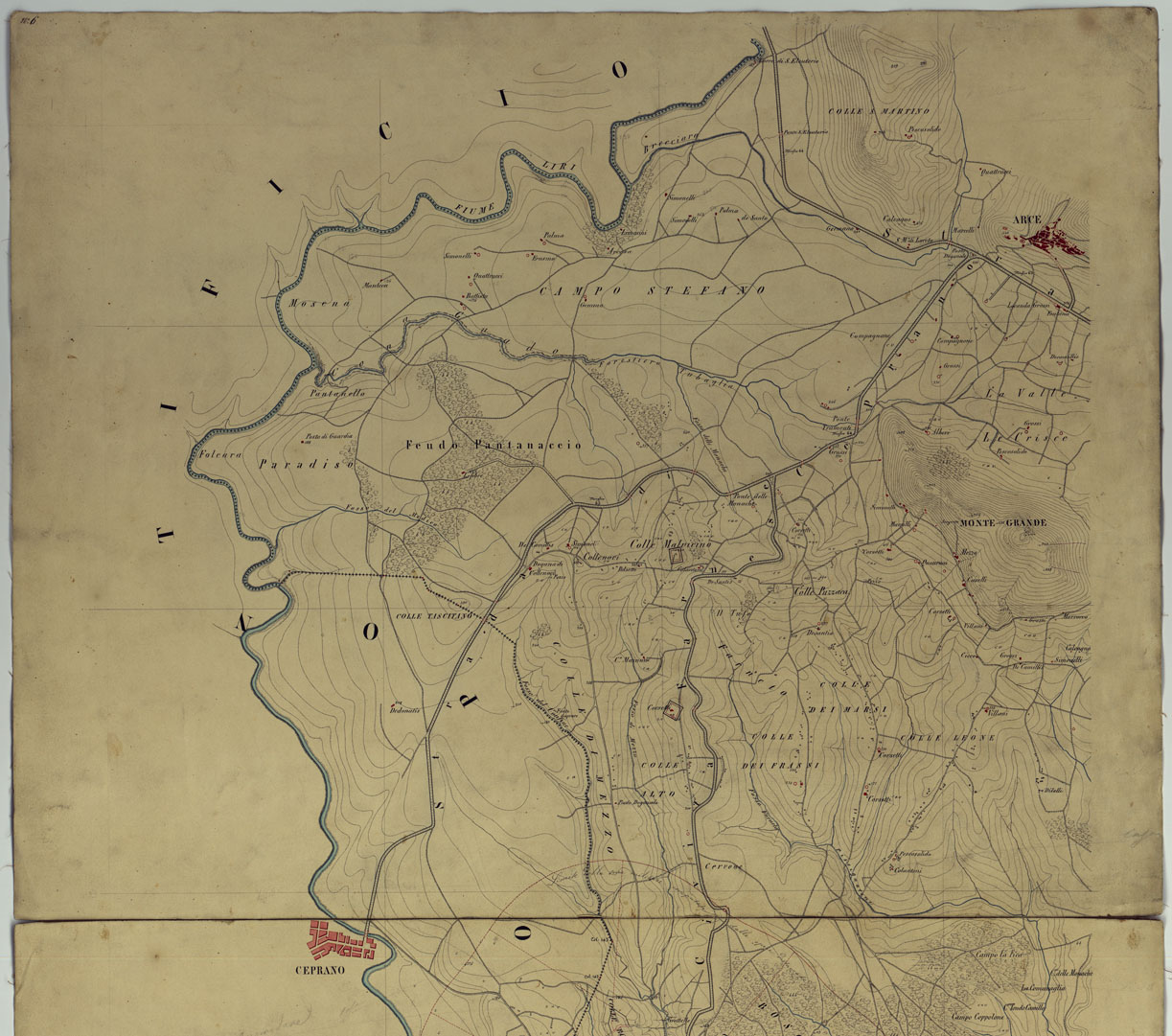 PIANTA TOPOGRAFICA DEL TERRENO LIMITATO DAL FIUME LIRI DALLE COLLINE DI S. GIOVANNI INCARICO DAL TORRENTE MELFI E DALLA STRADA ROTABILE DI SORA CON LE ALTURE ADIACENTI FINO AD ARCE - PARTE 1 E 2.