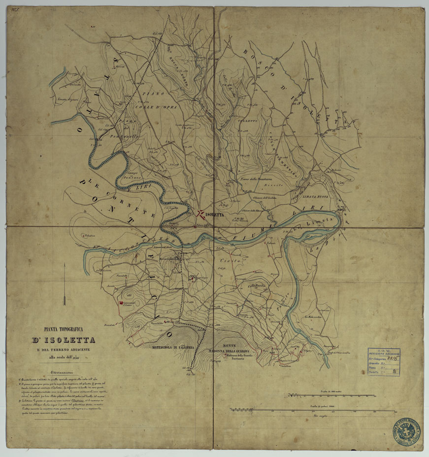 "Carta diesegnata, su foglio unico, montato su tela a stacchi. L'orografia è rappresentata mediante curve di livello tracciate all'equidistanza di 30 palmi gli abitati sono in rosso le curve in azzurro. Questa pianta è derivata, come i documenti 8813 e 8815 dalla carta speciale eseguita alla scala di 1:2.000 nel 1853 di cui al N° 52 d'ordine (Cart. d'Arch. N° 74 Doc. N°8817)"