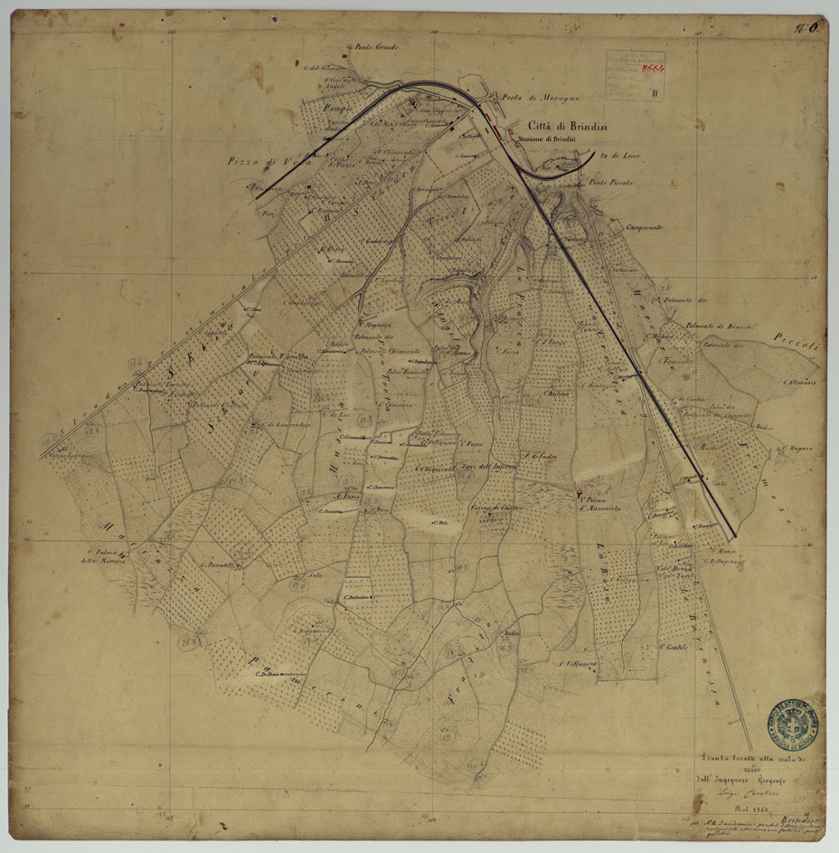 "Documento n. 20. Dieci minute dei rilievi eseguiti da ufficiali del R. Officio Topografico di Napoli. Dimensioni varie. L'orografia è rappresentata mediante curve di livello tracciate all'equidistanza di 5 metri. Vedi anche il documento: PIANTA TOPOGRAFICA DI BRINDISI E DINTORNI."