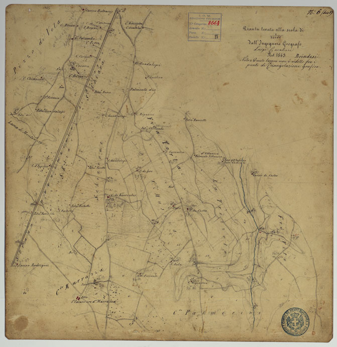 "Documento n. 20. Dieci minute dei rilievi eseguiti da ufficiali del R. Officio Topografico di Napoli. Dimensioni varie. L'orografia è rappresentata mediante curve di livello tracciate all'equidistanza di 5 metri. Vedi anche il documento: PIANTA TOPOGRAFICA DI BRINDISI E DINTORNI."