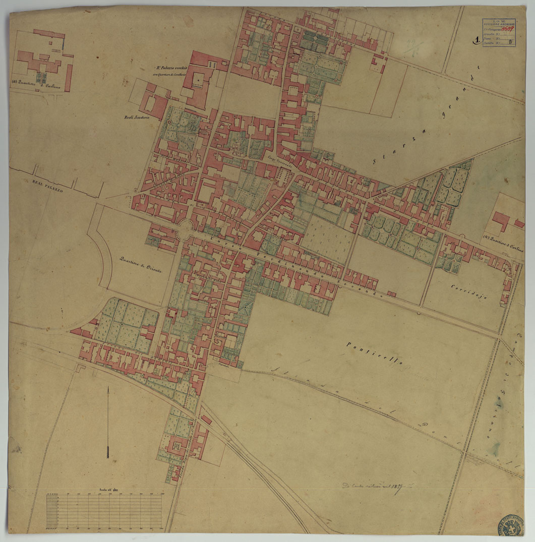 "Documento n. 28. Dimensioni varie. Cinque minute di campagna rilevate dall'Ing. Di Carlo del R. Officio Topografico di Napoli. Disegno a colori rosso per le costruzioni, verde per le colture ed i giardini. Confronta anche il documento PIANTA DELLA CITTA' DI CASERTA LEVATA NELL'ANNO 1857."