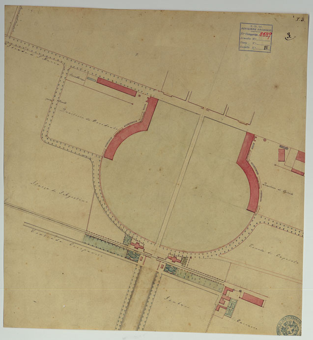"Documento n. 28. Dimensioni varie. Cinque minute di campagna rilevate dall'Ing. Di Carlo del R. Officio Topografico di Napoli. Disegno a colori rosso per le costruzioni, verde per le colture ed i giardini. Confronta anche il documento PIANTA DELLA CITTA' DI CASERTA LEVATA NELL'ANNO 1857..., corrispondente ai files A0001713-1716."