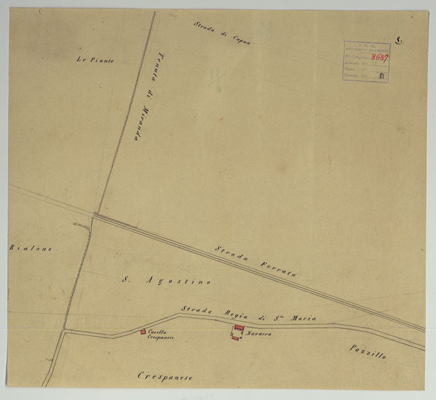 "Documento n. 28. Dimensioni varie. Cinque minute di campagna rilevate dall'Ing. Di Carlo del R. Officio Topografico di Napoli. Disegno a colori rosso per le costruzioni, verde per le colture ed i giardini. Confronta anche il documento PIANTA DELLA CITTA' DI CASERTA LEVATA NELL'ANNO 1857."