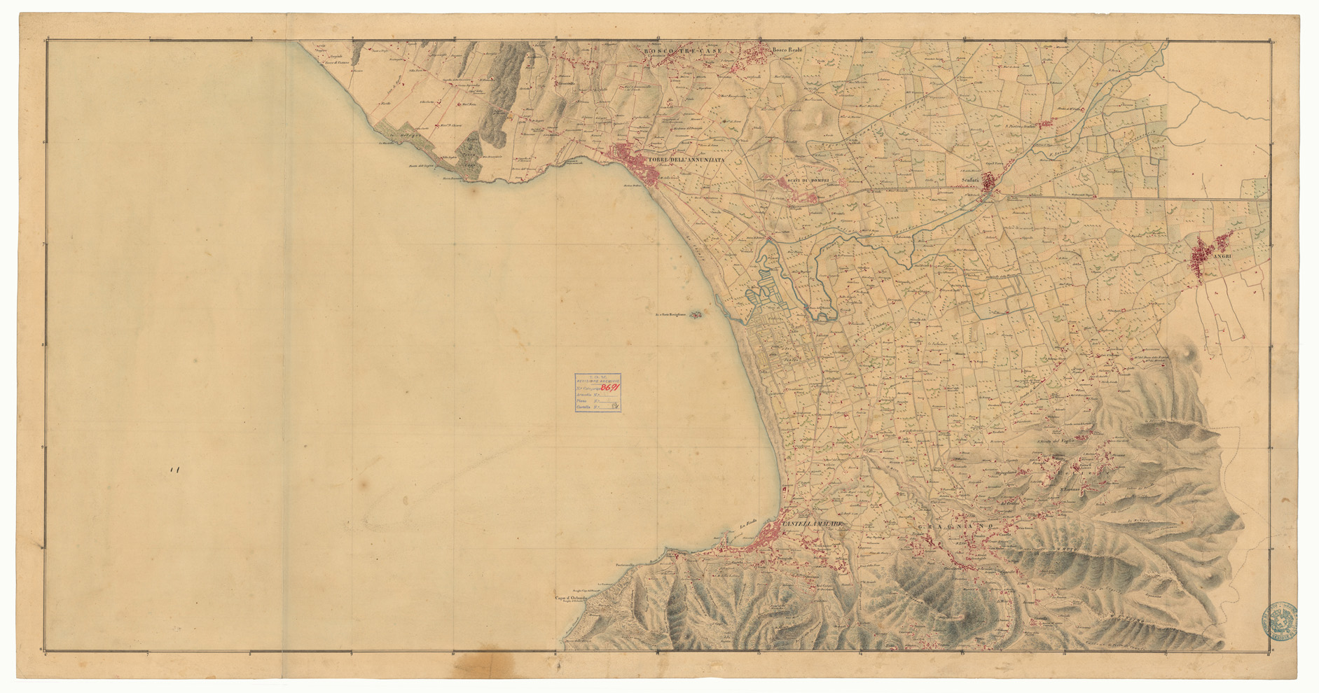 "Epoca supposta. Carta in due fogli montati su tela. Rappresenta il tratto costiero compreso fra Torre Bassano e Capo Conca e il territorio interno fino ad Angri. Il rilievo orografico è rappresentato con notevole evidenza mediante un fine tratteggio: gli abitati sono in rosso, le acque in azzurro, la vegetazione in verde. Carta assai pregevole."