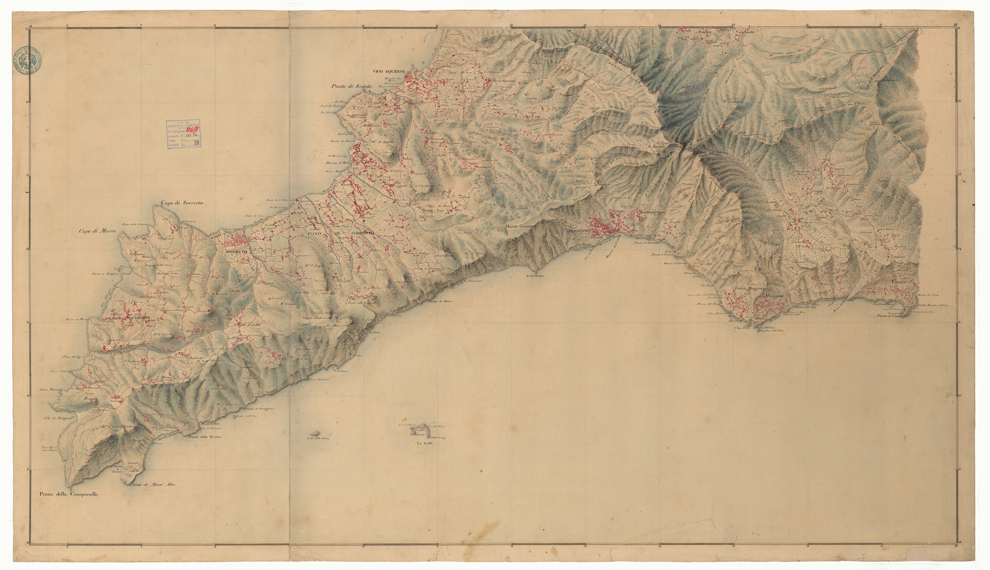 "Epoca supposta. Carta in due fogli montati su tela. Rappresenta il tratto costiero compreso fra Torre Bassano e Capo Conca e il territorio interno fino ad Angri. Il rilievo orografico è rappresentato con notevole evidenza mediante un fine tratteggio: gli abitati sono in rosso, le acque in azzurro, la vegetazione in verde. Carta assai pregevole."