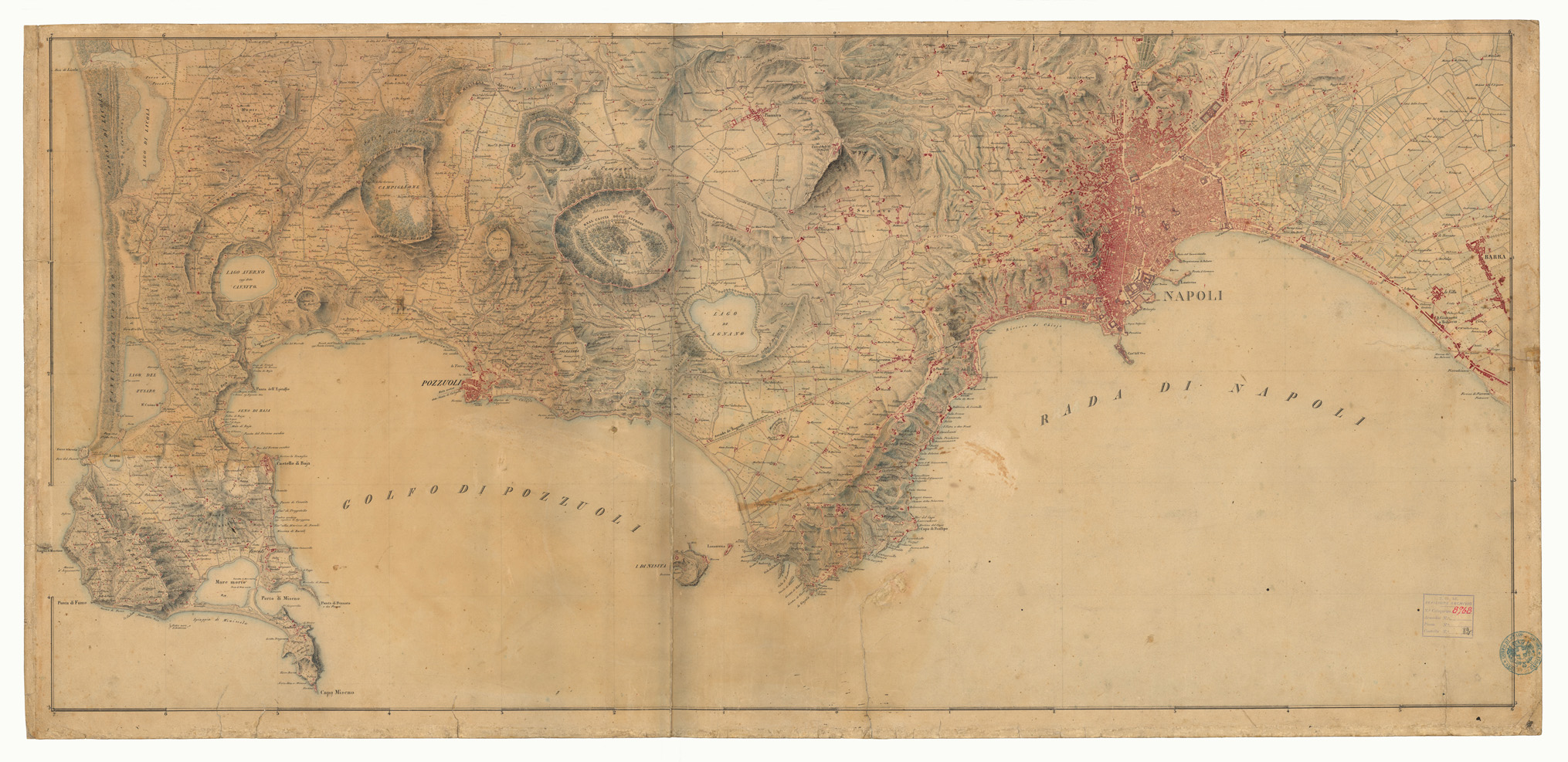 "Documento n. 57. Acquerello ritenuto eseguito dal 1815 in poi, senza firma, con orografia rappresentata mediante un fine tratteggio a luce obliqua, abitati in rosso, acque in azzurro, vegetazione e colture in verde. Lavoro assai pregevole. Un foglio montato su tela. Il territorio rappresentato si estende sulla costa da Foce di Licola a Pietrarsa e nell'interno fino oltre Pianura."