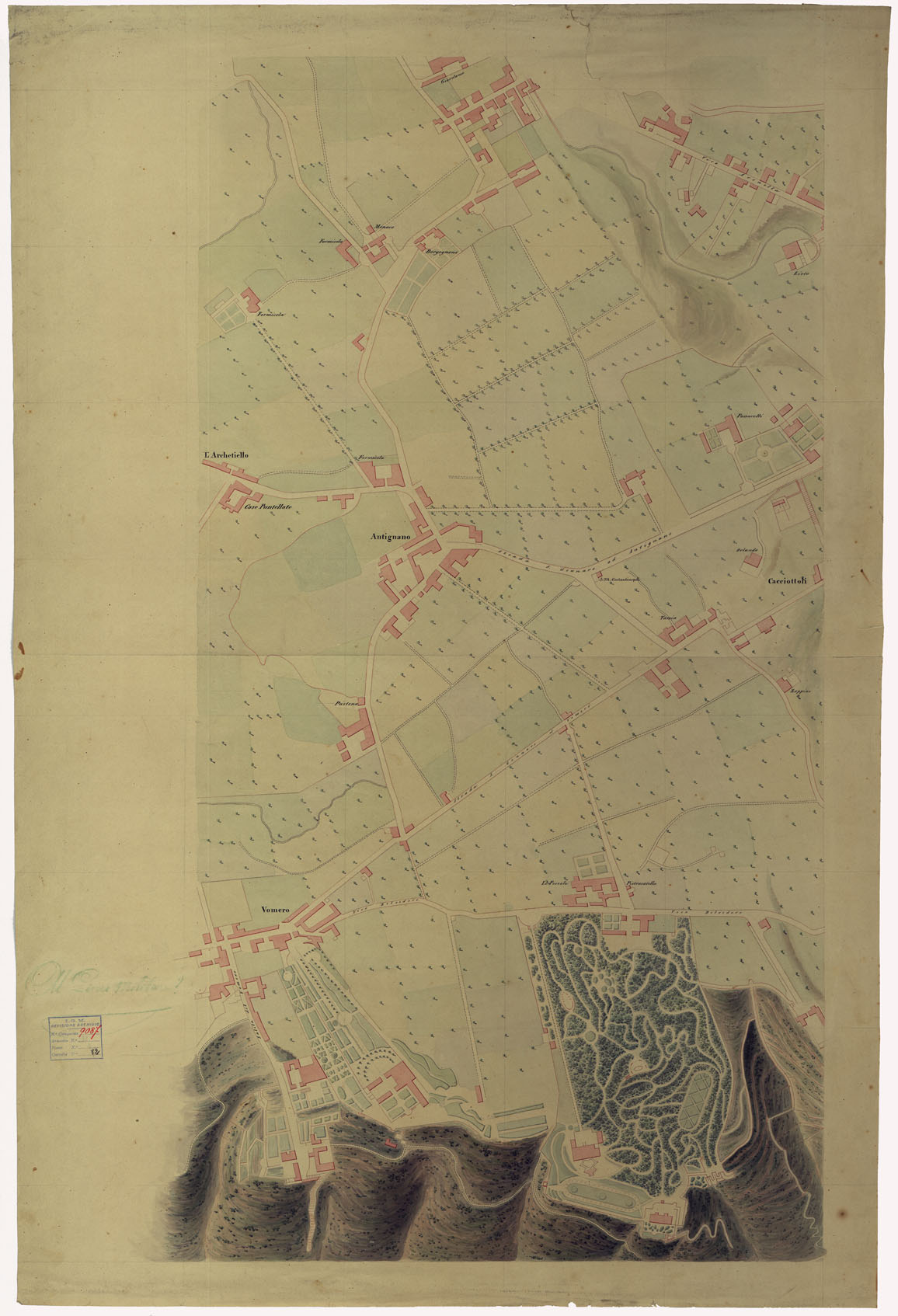 "Documento n. 59. Epoca supposta 1850. Due fogli disegnati con maestria ad acquerello, con orografia rappresentata mediante un ombreggiamento a sfumo, costruzioni in rosso, giardini, coltivazioni e vegetazioni in verde. Il Docum. 60 -9088 (categorico) Cart. d'Arch. 82 avente lo stesso titolo è la riduzione di questo documento alla scala 1:4.000."