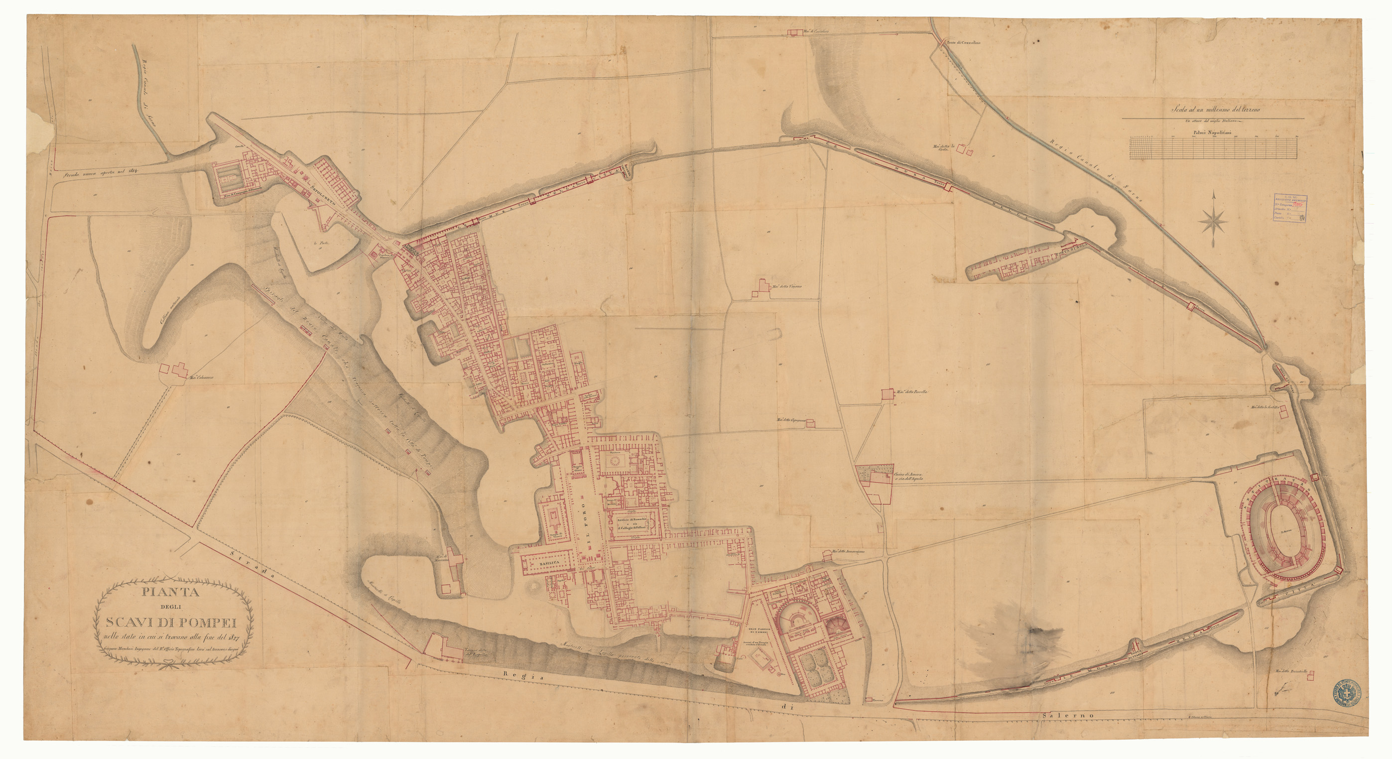 "GASPARE MARCHESI INGEGNERE DEL R.LE OFFICIO TOPOGRAFICO LEVO' SUL TERRENO, E DISEGNO'. Docum. n. 61. Grande pianta in vari fogli riuniti su tela. Disegnata in rosso per gli scavi, nero per il rimanente e il tratteggio. Questa pianta venne inclusa nella carta di Napoli e dintorni al 25.000 foglio n. 13 (Carta Topografica ed Idrografica dei contorni di Napoli... n. 34 d'Ordine - Cart. d'Arch. 86 - Docum. n. 14).La stessa carta incompleta è anche al Documento n. 62, (Docum. n. 9017 di categorico - Cart.d'Arch.75). Cfr. "Scavi di Pompei" (Docum. n. 63 - Categorico n. 9018) documento composto dalle minute che sono servite per la formazione di questa carta."