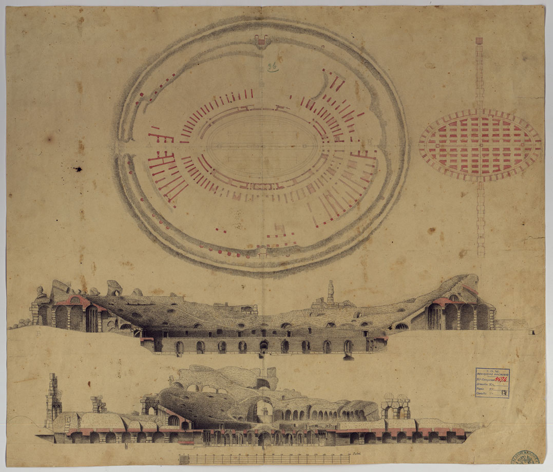 "Docum. n. 65. Piano analogo al docum. n. 64 "Anfiteatro Campano" - n. 8693 di categorico - Cart. d'Arch. 82 - probabilmente dello stesso autore (Gaspare Marchesi) e della stessa data, con sezioni prospettiche dell'Anfiteatro stesso. Cfr. anche Docum. n. 66 "Anfiteatro Campano e Dintorni" - n. 8695 di categorico - Cart. d'Arch. 82 - , documento analogo anche per l'autore e la data."