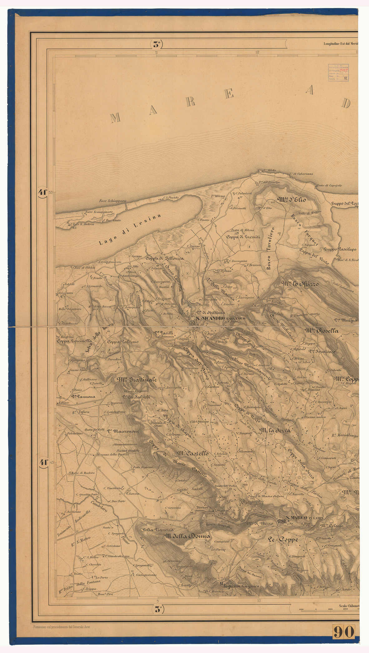 "Bella carta in due fogli montata su tela, disegnati per essere ridotti alla scala di 1:100.000 in fotoincisione secondo il procedimento Avet. L'orografia vi è rappresentata a curve di livello e tratteggio. La data è presunta. Questo documento è composto da tre fogli, uno dei quali è il montaggio corrispondente a due files (A2309-10)."