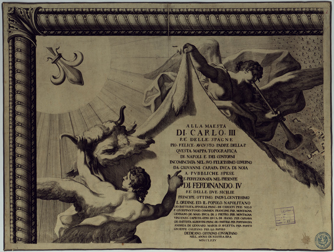 "Grande carta in 35 fogli incisa su rame. L'esecuzione di questa carta venne decretata nel 1750 e commessa a G. Carafa Duca di Noja il quale fu assistito dal "gromatico Vanti che ne formò l'intera delineazione geometrica" l'incisione in rame venne affidata ai Prof.i Campana, Aloja e Lamarra. Morto il Carafa l'opera rimase interrotta essa venne ripresa nel 1769 affidata a Gio. Pignatelli Principe di Monterodumi "che la ornò e condusse in fine". Nel 1775 vi furono fatte le correzioni ed aggiornamenti a cura del Prof. di Architettura e Matematica Niccolò Carletti che ci aggiunse anche una lunga "Spiegazione storiografica dell'antico e moderno". Il foglio N° 1 contiene la seguente dedica: "Alla Maestà- di Carlo III- Re delle Spagne- Pio Felice Augusto. Padre della P.- Questa mappa Topografica- di Napoli e dei Contorni- Incominciata nel suo felicissimo Governo - da Giovanni Carafa Duca di Noja- a pubbliche spese- e perfezionata nel presente-di Ferdinando IV- Re delle due Sicilie- Principe ottimo indulgentissimo- L'Ordine ed il Popolo Napolitano- Gio. Battista Spinelli Princ. di Cariati per Nilo- F. Giuseppantonio Comm. Francone per Montagna- Gennaro De Maio Duca di San Pietro per Montagna- Vincenzo Capecelatro Duca di Siano per Capoana- Gio. Battista Albertini Princ. di Cimitile per Portanuova- Andrea di Gennaro March. D'Auletta per Porto - Giuseppe Califano per lo Popolo. Dedicano. Offrono. Consacrano- nell'Anno di nostra Era- MDCCLXXV.- Il foglio N° 19 contiene le scale grafiche in pertiche napoletane, piedi parigini, piedi di Londra, palmi romani. I fogli N.i 24-34 contengono una "Veduta scenografica a ponente della Città di Napoli in Campagna Felice" la "Spiegazione storiografica dell'antico e del moderno della città di Napoli" e notizie sulla costruzione della carta. Il foglio N° 35 contiene tre iscrizioni greche tratte dal vol. III del "Corpus Inscriptionum Graecarum" N.i 5788, 5805, 5823 nella parte che si riferisce alla Magna Grecia. Due copie (la copia è il documento n. 2) alla prima delle quali è annessa la "Topografia dell'Agro Napoletano con le sue adiacenze. Delineata dal R. Geografo G. A. Rizzi Zannoni MDCCXCIII" alla scala approssimativa di 1:50.000 artistica ed accurata incisione in rame, su la quale è stato tracciato a mano il quadro d'unione."