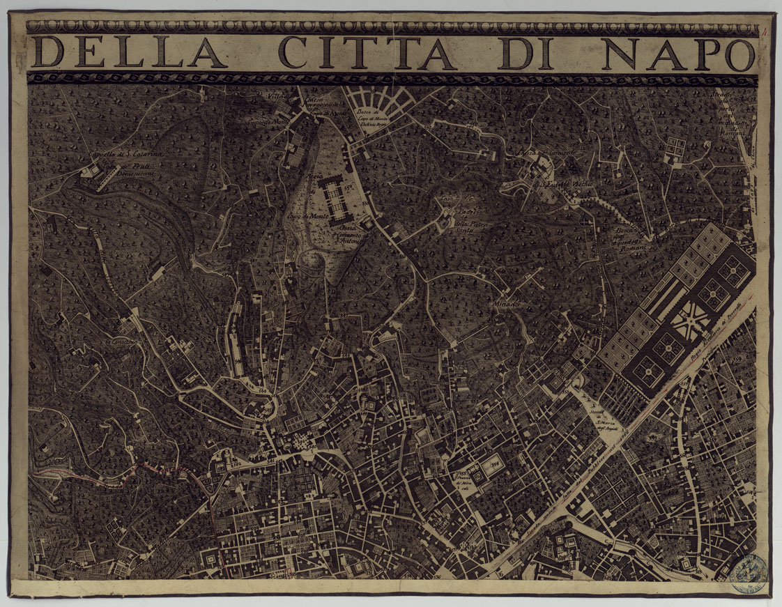 "Grande carta in 35 fogli incisa su rame. L'esecuzione di questa carta venne decretata nel 1750 e commessa a G. Carafa Duca di Noja il quale fu assistito dal "gromatico Vanti che ne formò l'intera delineazione geometrica" l'incisione in rame venne affidata ai Prof.i Campana, Aloja e Lamarra. Morto il Carafa l'opera rimase interrotta essa venne ripresa nel 1769 affidata a Gio. Pignatelli Principe di Monterodumi "che la ornò e condusse in fine". Nel 1775 vi furono fatte le correzioni ed aggiornamenti a cura del Prof. di Architettura e Matematica Niccolò Carletti che ci aggiunse anche una lunga "Spiegazione storiografica dell'antico e moderno". Il foglio N° 1 contiene la seguente dedica: "Alla Maestà- di Carlo III- Re delle Spagne- Pio Felice Augusto. Padre della P.- Questa mappa Topografica- di Napoli e dei Contorni- Incominciata nel suo felicissimo Governo - da Giovanni Carafa Duca di Noja- a pubbliche spese- e perfezionata nel presente-di Ferdinando IV- Re delle due Sicilie- Principe ottimo indulgentissimo- L'Ordine ed il Popolo Napolitano- Gio. Battista Spinelli Princ. di Cariati per Nilo- F. Giuseppantonio Comm. Francone per Montagna- Gennaro De Maio Duca di San Pietro per Montagna- Vincenzo Capecelatro Duca di Siano per Capoana- Gio. Battista Albertini Princ. di Cimitile per Portanuova- Andrea di Gennaro March. D'Auletta per Porto - Giuseppe Califano per lo Popolo. Dedicano. Offrono. Consacrano- nell'Anno di nostra Era- MDCCLXXV.- Il foglio N° 19 contiene le scale grafiche in pertiche napoletane, piedi parigini, piedi di Londra, palmi romani. I fogli N.i 24-34 contengono una "Veduta scenografica a ponente della Città di Napoli in Campagna Felice" la "Spiegazione storiografica dell'antico e del moderno della città di Napoli" e notizie sulla costruzione della carta. Il foglio N° 35 contiene tre iscrizioni greche tratte dal vol. III del "Corpus Inscriptionum Graecarum" N.i 5788, 5805, 5823 nella parte che si riferisce alla Magna Grecia. Due copie (la copia è il documento n. 2) alla prima delle quali è annessa la "Topografia dell'Agro Napoletano con le sue adiacenze. Delineata dal R. Geografo G. A. Rizzi Zannoni MDCCXCIII" alla scala approssimativa di 1:50.000 artistica ed accurata incisione in rame, su la quale è stato tracciato a mano il quadro d'unione."