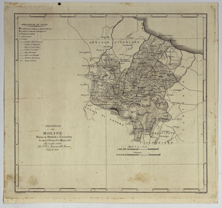 ATLANTE DELLE QUINDICI PROVINCIE AL DI QUA DEL FARO DEL REGNO DELLE DUE SICILIE A NORMA DELLA LEGGE DEL 1° MAGGIO 1816. INCISE D'ORDINE DI S. E. IL SEGRETARIO DI STATO MINISTRO DEGLI AFFARI INTERNI DA GENNARO BARTOLI - PROVINCIA DI MOLISE.