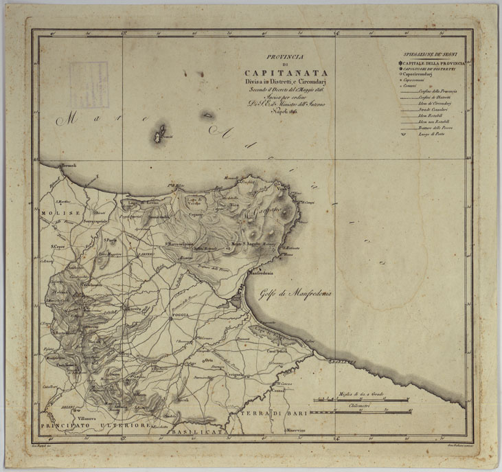 ATLANTE DELLE QUINDICI PROVINCIE AL DI QUA DEL FARO DEL REGNO DELLE DUE SICILIE A NORMA DELLA LEGGE DEL 1° MAGGIO 1816. INCISE D'ORDINE DI S. E. IL SEGRETARIO DI STATO MINISTRO DEGLI AFFARI INTERNI DA GENNARO BARTOLI - PROVINCIA DI CAPITANATA.