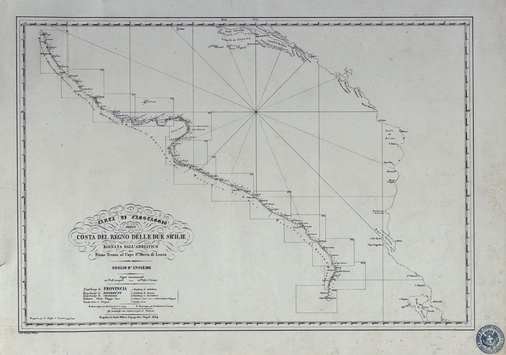 CARTA DI CABOTAGGIO DELLA COSTA DEL REGNO DELLE DUE SICILIE BAGNATA DALL'ADRIATICO DAL FIUME TRONTO AL CAPO DI S.TA MARIA DI LEUCA ESEGUITA NEL REALE OFFICIO TOPOGRAFICO. NAPOLI, 1834 - FOGLIO D'INSIEME.