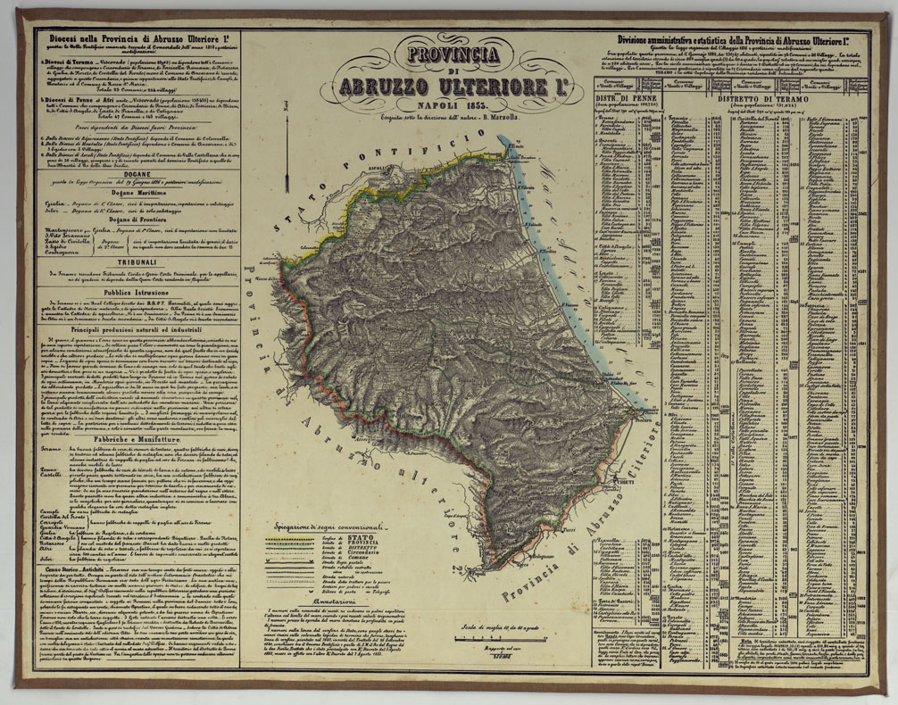 "Carta in ventitre fogli montati su tela, stampati a colori in litografia, eseguiti sotto la direzione dell'autore B. Marzolla. Annesso un foglio d'insieme per il Regno delle Due Sicilie alla scala di 1:2.500.000 circa, su cui trovasi scritto: "Atlante geografico di B. Marzolla pubblicandosi ora da L. Manzella, Napoli 1859, nello Stabilimento Geografico". Le carte distinguono a segni e colori i confini di stato, di provincia, di distretto, di circondario, di comune, le strade regie postali, rotabili, in costruzione, sentieri per cavalli e per pedoni, stazioni di posta, telegrafi. L'orografia è rappresentata col tratteggio a luce obliqua. Ciascun foglio contiene attorno al campo disegnato un quadro statistico-amministrativo, ed ampie notizie storiche e di geografia fisica ed economica: ognuno è distinto da un titolo particolare. Un documento analogo si trova al n. 128 d'inv. gen. appartenente alla Biblioteca (files B0001333-1356)."
