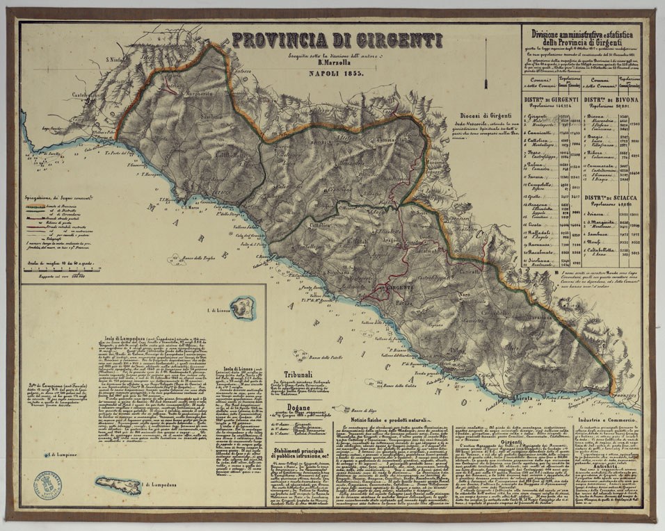 "Carta in ventitre fogli montati su tela, stampati a colori in litografia, eseguiti sotto la direzione dell'autore B. Marzolla. Annesso un foglio d'insieme per il Regno delle Due Sicilie alla scala di 1:2.500.000 circa, su cui trovasi scritto: "Atlante geografico di B. Marzolla pubblicandosi ora da L. Manzella, Napoli 1859, nello Stabilimento Geografico". Le carte distinguono a segni e colori i confini di stato, di provincia, di distretto, di circondario, di comune, le strade regie postali, rotabili, in costruzione, sentieri per cavalli e per pedoni, stazioni di posta, telegrafi. L'orografia è rappresentata col tratteggio a luce obliqua. Ciascun foglio contiene attorno al campo disegnato un quadro statistico-amministrativo, ed ampie notizie storiche e di geografia fisica ed economica: ognuno è distinto da un titolo particolare. Un documento analogo si trova al n. 128 d'inv. gen. appartenente alla Biblioteca (files B0001333-1356)."