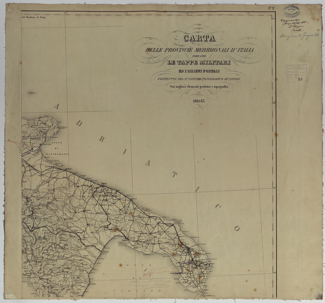 CARTA DELLE PROVINCIE MERIDIONALI D'ITALIA INDICANTE LE TAPPE MILITARI ED I RILIEVI POSTALI COSTRUTTA NEL R.LE OFFICIO TOPOGRAFICO DI NAPOLI SUI MIGLIORI ELEMENTI GEODETICI E TOPOGRAFICI - FOGLIO 2.