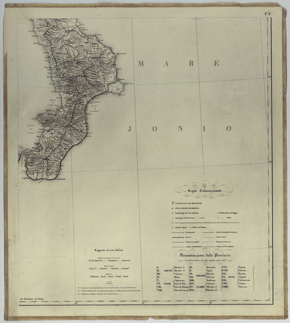 "ella carta in quattro fogli tratti da incisione su pietra stampati in nero. L'orografia è rappresentata con fine tratteggio a luce obliqua. Gli abitati sono distinti in base alla loro importanza amministrativa. Sono indicati i capoluoghi di divisione, le tappe, piazze forti, corti di appello, tribunali di circondario, tribunali di commercio, stazioni di posta. Le strade sono classificate in postali, carrozzabili, in costruzione, vicinali, tratturi per le pecore, ferrovie. Sono indicati i confini di Provincia e di Circondario. Le altitudini sono calcolate in metri. Le longitudini sono calcolate dal Meridiano di Parigi. Il foglio N° 4 contiene le leggenda dei segni convenzionali, le denominazione delle Provincie secondo il numero d'ordine segnato sulla carta, la scala numerica e quelle grafiche. Due copie di cui una in Biblioteca N°48 d'inv. generale."