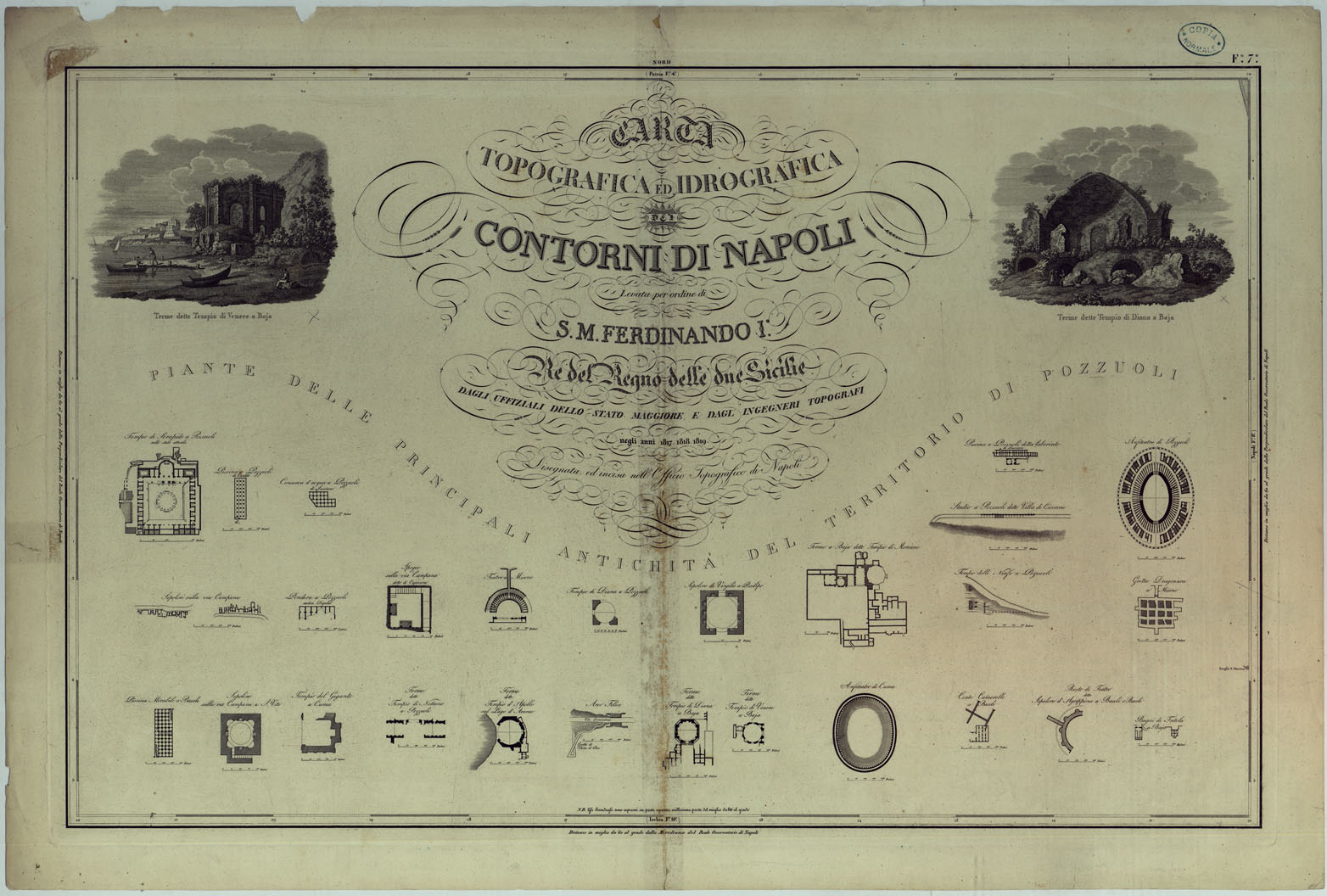"DISEGNATA ED INCISA NELL'OFFICIO TOPOGRAFICO DI NAPOLI. Questa carta si compone di 15 fogli (in origine 9, e poi portati a 12) incisi su rame, stampati in nero. Essa è basata sulle mappe catastali già esistenti al 10.000, ridotte alla scala di 1: 20.000, riconosciute sul terreno e poggiate sui lavori di triangolazione eseguiti dal 1816 al 1819 nel territorio di Napoli, con aggiunta dei rilievi idrografici lungo le coste del Golfo e delle Isole. Le longitudini sono calcolate dal meridiano del R. Osservatorio di Napoli. L ' orografia è rappresentata con fine tratteggio a luce obliqua. Gli scandagli sono calcolati in passi. La carta è notevole per la chiarezza del disegno. Essa mostra centri abitati, strade, fiumi, colture e vegetazioni, ecc., con particolare ricchezza di dettagli. IL foglio N° 7 contiene il titolo e varie "piante delle principali antichità del territorio di Pozzuoli". Il foglio N° 10 contiene l ' Isola d ' Ischia il foglio N° 11 la rosa dei venti il foglio N° 13 la " Pianta degli scavi di Pompei nello stato in cui si trovano alla fine del 1875. Delineata ed incisa nel R. Officio Topografico della guerra. Napoli" alla scala di 1: 2.000 il foglio N° 14 l'Isola di Capri. Due copie d'Archivio (Cart. d ' Arch. N° 86, Docum. N° 14) una delle quali incompleta con la pianta di Pompei a data imprecisata 184.. Altre due copie (N° 78 d ' inv. gen.) sono pure incomplete con la pianta di Pompei alla data 1875 e annesso un quadro d ' unione."