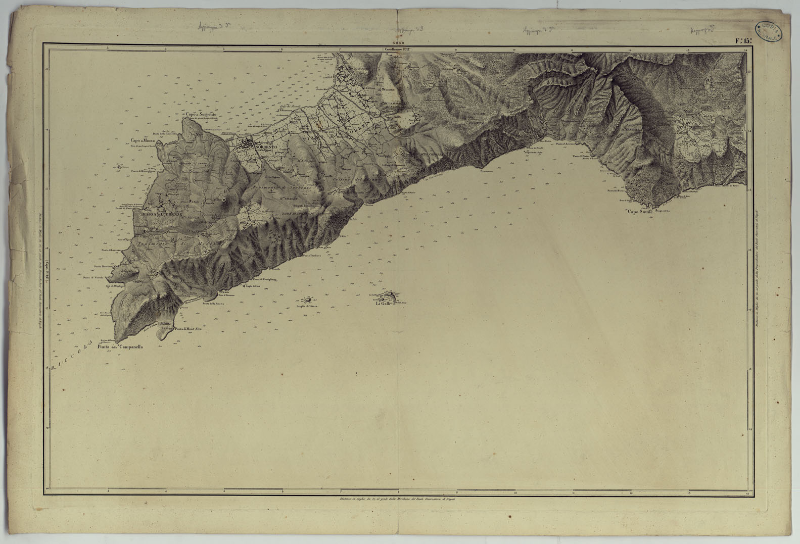 "DISEGNATA ED INCISA NELL'OFFICIO TOPOGRAFICO DI NAPOLI. Questa carta si compone di 15 fogli (in origine 9, e poi portati a 12) incisi su rame, stampati in nero. Essa è basata sulle mappe catastali già esistenti al 10.000, ridotte alla scala di 1: 20.000, riconosciute sul terreno e poggiate sui lavori di triangolazione eseguiti dal 1816 al 1819 nel territorio di Napoli, con aggiunta dei rilievi idrografici lungo le coste del Golfo e delle Isole. Le longitudini sono calcolate dal meridiano del R. Osservatorio di Napoli. L ' orografia è rappresentata con fine tratteggio a luce obliqua. Gli scandagli sono calcolati in passi. La carta è notevole per la chiarezza del disegno. Essa mostra centri abitati, strade, fiumi, colture e vegetazioni, ecc., con particolare ricchezza di dettagli. IL foglio N° 7 contiene il titolo e varie "piante delle principali antichità del territorio di Pozzuoli". Il foglio N° 10 contiene l ' Isola d ' Ischia il foglio N° 11 la rosa dei venti il foglio N° 13 la " Pianta degli scavi di Pompei nello stato in cui si trovano alla fine del 1875. Delineata ed incisa nel R. Officio Topografico della guerra. Napoli" alla scala di 1: 2.000 il foglio N° 14 l'Isola di Capri. Due copie d'Archivio (Cart. d ' Arch. N° 86, Docum. N° 14) una delle quali incompleta con la pianta di Pompei a data imprecisata 184.. Altre due copie (N° 78 d ' inv. gen. ) sono pure incomplete con la pianta di Pompei alla data 1875 e annesso un quadro d ' unione."