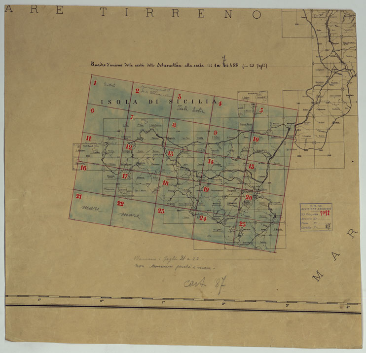 "DIVISA IN (25) 23 FOGLI DILIGENTEMENTE DELINEATA GIUSTA LE LEGGI ASTRONOMICHE E TOPOGRAFICHE PER ORDINE DELLA MAESTA' DELL'IMPERATORE CARLO VI NEGLI ANNI 1719, 1720, 1721, DAL SIGNOR BARONE SAMUELE DI SCHMETTAU ALLORA AL SERVIZIO AUSTRIACO E POI MARESCIALLO E GRAN MAESTRO D'ARTIGLIERIA NEGLI ESERCITI DI SUA MAESTA' IL RE DI PRUSSIA. QUESTA CARTA RETTIFICATA PER ORDINE DELLE MAESTA' DEL RE, E DELLA REGINA DELLE DUE SICILIE L'ANNO 1800 ESCE ORA ALLA LUCE COME UN MONUMENTO ALLA MEMORIA E ALL'INGEGNO DEL MARESCIALLO CONTE DI SCHIMETTAU PER OPERA DEL DI LUI FIGLIO. Antico lucido ricavato dalla carta originale costruita dal 1719 al 1721 dal generale barone Samuele di Schmettau dietro incarico dell'Imperatore Carlo VI, durante la guerra di successione spagnuola. Questa carta non venne mai pubblicata: si ritiene che i disegni originali pervenissero al "Depot de la Guerre" di Parigi in seguito all'acquisto della raccolta di carte topografiche provenienti dal Gabinetto del figlio dello Schmettau, conservate dall'editore Shropp di Berlino. Questo lucido mostra che il figlio del Barone Samuele si era proposto di riprodurre la carta, con nuove correzioni, per ordine del Re di Sicilia. Il lucido rappresenta l'orografia col tratteggio (montagna e roccia): gli abitati sono rappresentati in pianta riempiti in rosso le strade sono classificate in vie maestre e sentieri sono pure indicati forti, fortezze, crateri, corso delle lave e zone boschive. Uno dei fogli contiene il titolo (in italiano e in francese) un altro reca la leggenda dei segni convenzionali e le scale grafiche in canne siciliane, miglia italiane, pertiche del Reno e tese di Francia. Di questa carta fu eseguita una riduzione in 4 fogli pubblicata nel 1748 col titolo: "Description nouvelle et exacte de Toute l'Ile de Sicile" di cui il "Depot de la Guerre" possedeva nel 1802, tre copie e che costituì la miglior rappresentazione cartografica dell'isola per tutto il secolo XVII. (Cfr. Revelli P., "Intorno alla carta della Sicilia" 1719-21 di Samuele Schmettau R.G.I., 1909. Mori A., "La cartografia ufficiale dell'Italia e l'I.G.M.", 1922. Firenze)."