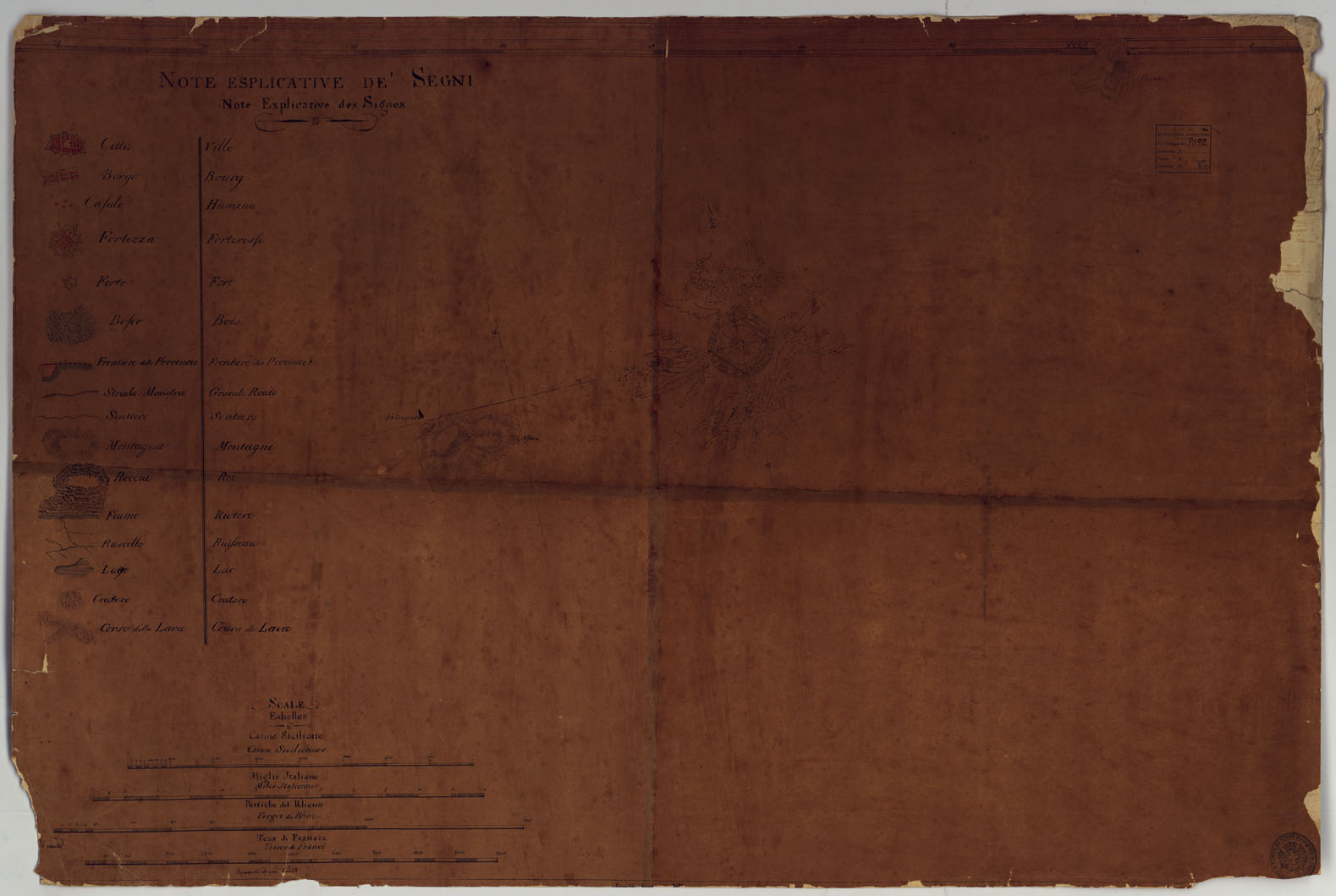 "DIVISA IN (25) 23 FOGLI DILIGENTEMENTE DELINEATA GIUSTA LE LEGGI ASTRONOMICHE E TOPOGRAFICHE PER ORDINE DELLA MAESTA' DELL'IMPERATORE CARLO VI NEGLI ANNI 1719, 1720, 1721, DAL SIGNOR BARONE SAMUELE DI SCHMETTAU ALLORA AL SERVIZIO AUSTRIACO E POI MARESCIALLO E GRAN MAESTRO D'ARTIGLIERIA NEGLI ESERCITI DI SUA MAESTA' IL RE DI PRUSSIA. QUESTA CARTA RETTIFICATA PER ORDINE DELLE MAESTA' DEL RE, E DELLA REGINA DELLE DUE SICILIE L'ANNO 1800 ESCE ORA ALLA LUCE COME UN MONUMENTO ALLA MEMORIA E ALL'INGEGNO DEL MARESCIALLO CONTE DI SCHIMETTAU PER OPERA DEL DI LUI FIGLIO. Antico lucido ricavato dalla carta originale costruita dal 1719 al 1721 dal generale barone Samuele di Schmettau dietro incarico dell'Imperatore Carlo VI, durante la guerra di successione spagnuola. Questa carta non venne mai pubblicata: si ritiene che i disegni originali pervenissero al "Depot de la Guerre" di Parigi in seguito all'acquisto della raccolta di carte topografiche provenienti dal Gabinetto del figlio dello Schmettau, conservate dall'editore Shropp di Berlino. Questo lucido mostra che il figlio del Barone Samuele si era proposto di riprodurre la carta, con nuove correzioni, per ordine del Re di Sicilia. Il lucido rappresenta l'orografia col tratteggio (montagna e roccia): gli abitati sono rappresentati in pianta riempiti in rosso le strade sono classificate in vie maestre e sentieri sono pure indicati forti, fortezze, crateri, corso delle lave e zone boschive. Uno dei fogli contiene il titolo (in italiano e in francese) un altro reca la leggenda dei segni convenzionali e le scale grafiche in canne siciliane, miglia italiane, pertiche del Reno e tese di Francia. Di questa carta fu eseguita una riduzione in 4 fogli pubblicata nel 1748 col titolo: "Description nouvelle et exacte de Toute l'Ile de Sicile" di cui il "Depot de la Guerre" possedeva nel 1802, tre copie e che costituì la miglior rappresentazione cartografica dell'isola per tutto il secolo XVII. (Cfr. Revelli P., "Intorno alla carta della Sicilia" 1719-21 di Samuele Schmettau R.G.I., 1909. Mori A., "La cartografia ufficiale dell'Italia e l'I.G.M.", 1922. Firenze)."
