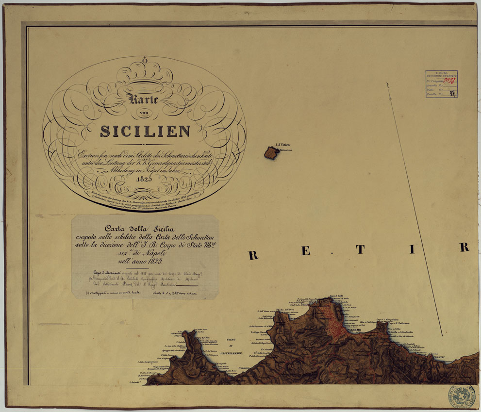 " (Carta della Sicilia disegnata sulla base della carta della Schmettau sotto la direzione dell'I. R. Stato Maggiore, Sezione di Napoli, nell'anno 1825. Copia del rilievo eseguito nel 1825 per cura del Corpo di Stato Maggiore. Disegnata nell'I. R. I.G.M. di Milano ad opera del Sottotenente Franz del 1° Regg. Fanteria Imperatore). Carta disegnata in quattro fogli montata su tela con orografia a tratteggio, abitati, forti e fortezze in rosso. E'ritenuta il modello della carta della Sicilia pubblicata dall'Officio Topografico di Napoli nel 1826. Questa carta, secondo le notizie forniteci dal Gen. C. Firrao (cfr. "Sull'Officio Topografico di Napoli, Origini e Vicende, Napoli, 1868) non risultò migliore di quella "Ricavata dall'Originale del Barone Schmettau-e dalle riconoscenze ed osservazioni-degli Officiali-dell'Officio Topografico dello Stato Maggiore Generale per ordine di S. M. Ferdinando IV Re-delle due Sicilie-delineata ed incisa presso l'Officio suddetto negli anni 1809 e 1810" in 4 fogli, alla scala approssimativa di 1:265.000. Poichè i rami di questa carta andarono perduti durante i moti del 1820, l'Officio Topografico di Napoli intraprese una nuova edizione che venne pubblicata nel 1826 (v. N° 11 d'Ordine, Cart. d'Arch. N° 97, Docum. N.i 3-4). Si confronti per maggiori notizie su queste carte, oltre alla citata opera del Firrao, Mori A., "La Cartografia Ufficiale in Italia e l'I.G.M., 1922, pagine 92-95."