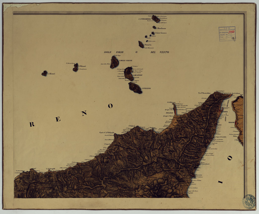 "(Carta della Sicilia disegnata sulla base della carta della Schmettau sotto la direzione dell'I. R. Stato Maggiore, Sezione di Napoli, nell'anno 1825. Copia del rilievo eseguito nel 1825 per cura del Corpo di Stato Maggiore. Disegnata nell'I. R. I.G.M. di Milano ad opera del Sottotenente Franz del 1° Regg. Fanteria Imperatore). Carta disegnata in quattro fogli montata su tela con orografia a tratteggio, abitati, forti e fortezze in rosso. E'ritenuta il modello della carta della Sicilia pubblicata dall'Officio Topografico di Napoli nel 1826. Questa carta, secondo le notizie forniteci dal Gen. C. Firrao (cfr. "Sull'Officio Topografico di Napoli, Origini e Vicende, Napoli, 1868) non risultò migliore di quella "Ricavata dall'Originale del Barone Schmettau-e dalle riconoscenze ed osservazioni-degli Officiali-dell'Officio Topografico dello Stato Maggiore Generale per ordine di S. M. Ferdinando IV Re-delle due Sicilie-delineata ed incisa presso l'Officio suddetto negli anni 1809 e 1810" in 4 fogli, alla scala approssimativa di 1:265.000. Poichè i rami di questa carta andarono perduti durante i moti del 1820, l'Officio Topografico di Napoli intraprese una nuova edizione che venne pubblicata nel 1826 (v. N° 11 d'Ordine, Cart. d'Arch. N° 97, Docum. N.i 3-4). Si confronti per maggiori notizie su queste carte, oltre alla citata opera del Firrao, Mori A., "La Cartografia Ufficiale in Italia e l'I.G.M., 1922, pagine 92-95."