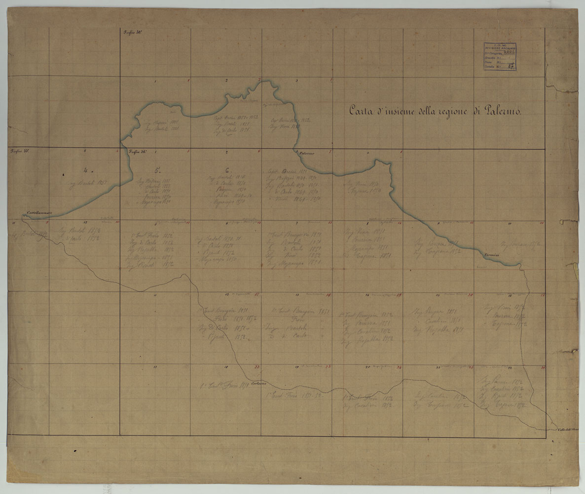 "Sono 26 tavolette più 4 quadri d'unione e 1 quadro d'insieme, montate su tela disegnate a colori rosso per gli abitati, azzurro per le acque, nero per il rimanente. L'orografia è dimostrata mediante curve di livello tracciate all'equidistanza di 10 passi (m. 18,52). Al titolo segue questa nota: "Questo lavoro porta la numerazione della Gran carta dell'ex Regno di Napoli ad 1:80.000 di cui fa parte. La proiezione di essa è lo sviluppo conico modificato il cui centro è l'intersezione del meridiano della specola Reale di Napoli col parallelo 40°. Il reticolato è di miglia italiane geografiche, la cui numerazione è origine dal centro suddetto. L'altezza dei punti dal livello del mare è espressa in passi geodetici essendo ognuno la millesima parte del miglio. L'equidistanza delle curve è di 10 passi". Trattasi quindi dei rilevamenti eseguiti per la progettata carta del Regno di Napoli alla scala di 1:80.000 (v. Italia meridionale: "Tavolette al 20.000 per la carta del Regno di Napoli alla scala di 1:80.000" - N° 43 d'ordine, Cart. d'Arch. N° 75-76-77, Docum. N° 9471 e "Carta del Regno di Napoli" - N° 48 d'ordine, Cart. d'Arch. 86, Docum. N° 13). Ciascun foglio reca i nomi degli operatori e la data dei rilevamenti. Annesso un quadro d'unione per l'intera carta alla scala di 1:490.700. Il quadro d'unione per la regione di Palermo è a 1:532.000."