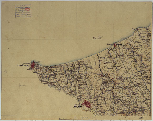"Docum. n. 3. Riduzioni delle levate al 20.000 eseguite dopo che l'Ufficio Topografico di Napoli passò, con decreto del 4 agosto 1861, a far parte dell'Ufficio Superiore di Stato Maggiore, come sezione separata dall'Ufficio di Torino. Sono quattro fogli e tre frazioni di foglio montati su tela, disegnati a colori, con orografia dimostrata mediante curve a tratteggio in bistro, abitati in rosso, acque in azzurro. il territorio rappresentato si estende da Palermo a Corleone ed Alcamo."