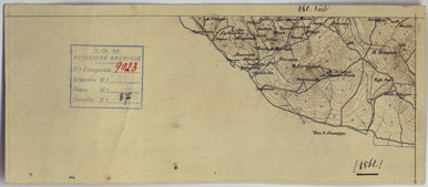 "Docum. n. 3. Riduzioni delle levate al 20.000 eseguite dopo che l'Ufficio Topografico di Napoli passò, con decreto del 4 agosto 1861, a far parte dell'Ufficio Superiore di Stato Maggiore, come sezione separata dall'Ufficio di Torino. Sono quattro fogli e tre frazioni di foglio montati su tela, disegnati a colori, con orografia dimostrata mediante curve a tratteggio in bistro, abitati in rosso, acque in azzurro. il territorio rappresentato si estende da Palermo a Corleone ed Alcamo. Localizzazione geografica per comune non individuata."