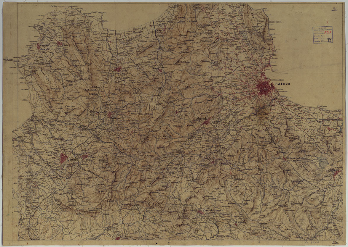 "Docum. n. 3. Riduzioni delle levate al 20.000 eseguite dopo che l'Ufficio Topografico di Napoli passò, con decreto del 4 agosto 1861, a far parte dell'Ufficio Superiore di Stato Maggiore, come sezione separata dall'Ufficio di Torino. Sono quattro fogli e tre frazioni di foglio montati su tela, disegnati a colori, con orografia dimostrata mediante curve a tratteggio in bistro, abitati in rosso, acque in azzurro. il territorio rappresentato si estende da Palermo a Corleone ed Alcamo."