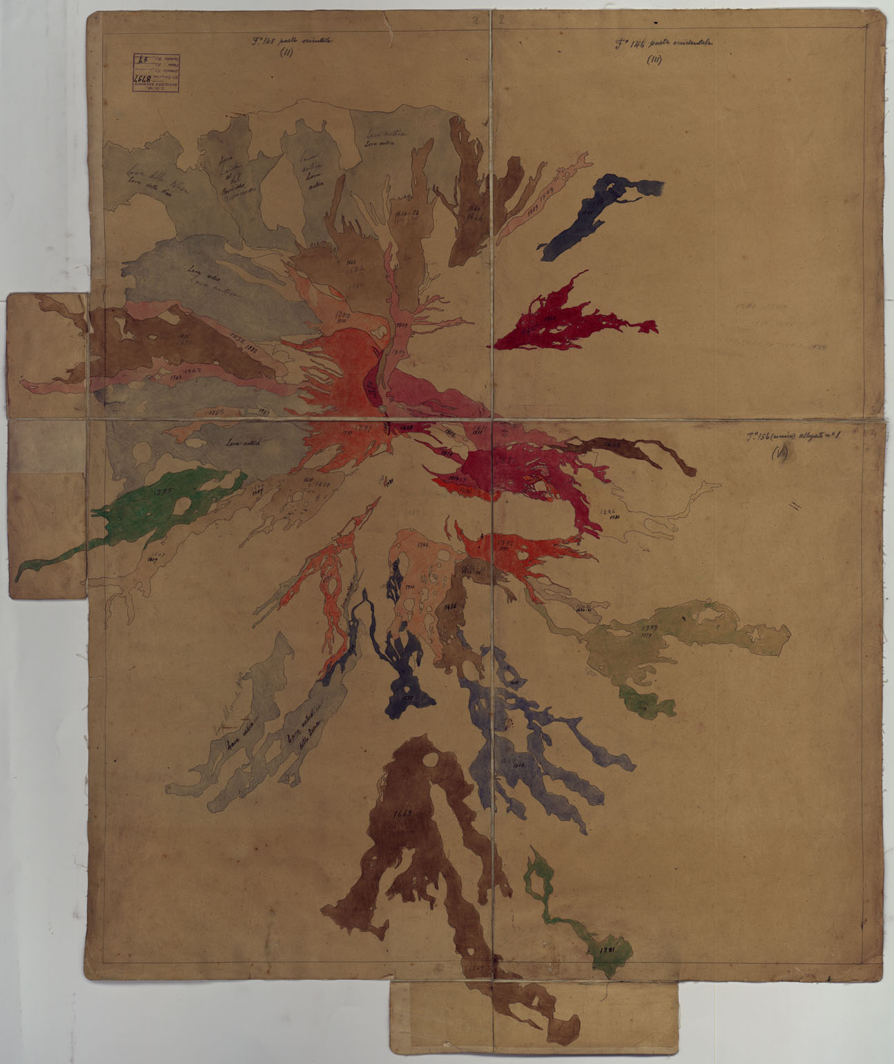 "Disegno in quattro fogli montati su tela a stacchi e due piccole aggiunte, con annessi relativi lucidi. Rappresenta le lave del vulcano dell'Etna nelle sue diverse fasi eruttive, dimostrate mediante vari colori. Si ritiene che questo disegno servisse per formare la carta geologica al 50.000 dell'Etna costruita dal Barone Sartorius di Waltershausen dal 1836 al 1848 e pubblicata in 13 fogli incisi su rame dal 1844 al 1857. Cfr. "Carta topografica dell'Etna..." - N° 123 d'Inv. Gen."